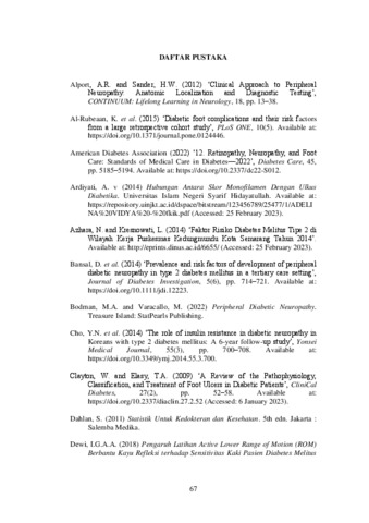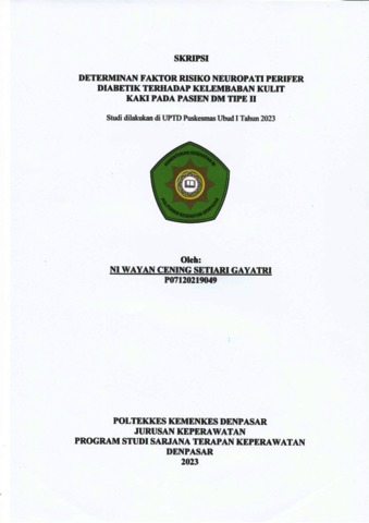 Gayatri, Ni Wayan Cening Setiari (2023) DETERMINAN FAKTOR RISIKO NEUROPATI PERIFER DIABETIK TERHADAP KELEMBABAN KULIT KAKI PADA PASIEN DM TIPE II DI UPTD PUSKESMAS UBUD I TAHUN 2023. Diploma thesis, Poltekkes Kemenkes Denpasar Jurusan Keperawatan 2023.