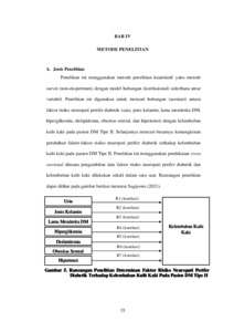 DETERMINANTS OF DIABETICS PERIPHERAL NEUROPATHY RISK FACTORS WITH FOOT SKIN MOISTURE IN TYPE II DM PATIENTS Ni Wayan Cening Setiari Gayatri ABSTRACT Diabetic peripheral neuropathy is one of the chronic complications of DM which causes dysfunction of the peripheral nervous system, can occur in the autonomic nerves characterized by a decrease in foot skin moisture. This study aims to determine the determinants of diabetic peripheral neuropathy risk factors with foot skin moisture in type II DM patients. The design of this research is non-experimental with a simple correlational methode. The sample in this research is 35 respondents who were selected by consecutive sampling at the UPTD Puskesmas Ubud I. The results of the ordinal logistic regression statistical test obtained p-value of Model Fitting Information is 0.002 (p-value <0.05) and p-value Pseudo R-Square Negelkerke is 0.681, which means the risk factors of diabetic peripheral neuropathy (age, duration of diabetes mellitus, gender, transient blood glucose, total cholesterol, waist circumference, systolic blood pressure, and diastolic pressure) together have a significant effect of 68.1% with foot skin moisture. The P-value of the Wald test for gender, duration of DM, transient blood glucose, and blood pressure <0.05 so that it can be stated that each the four risk factors of diabetic peripheral neuropathy partially have a significant effect with foot skin moisture. The odds ratio for systolic blood pressure is 1.132, which means that the higher the systolic blood pressure, the 1.312 times will have problems with foot skin moisture. Based on this research, suggested that the puskesmas service unit conduct inspection activities for diabetic peripheral neuropathy risk factors at least every month. Keywords: Determinants risk factors; diabetic peripheral neuropathy; autonomic neuropathy; foot skin moisture DETERMINAN FAKTOR RISIKO NEUROPATI PERIFER DIABETIK TERHADAP KELEMBABAN KULIT KAKI PADA PASIEN DM TIPE II Ni Wayan Cening Setiari Gayatri ABSTRAK Neuropati perifer diabetik merupakan salah satu komplikasi kronis DM yang menyebabkan disfungsi sistem saraf perifer, dapat terjadi pada saraf otonom ditandai dengan penurunan kelembaban kulit kaki. Penelitian ini bertujuan untuk mengetahui determinan faktor risiko neuropati perifer diabetik terhadap kelembaban kulit kaki pada pasien DM Tipe II. Desain penelitian ini adalah non-eksperimen dengan metode korelasional sederhana. Sampel dalam penelitian ini adalah 35 responden yang diseleksi secara consecutive sampling di UPTD Puskesmas Ubud I. Hasil uji statistik regresi logistik ordinal diperoleh p-value Model Fitting Information sebesar 0,002 (p-value <0,05) dan nilai Pseudo R-Square Negelkerke sebesar 0,681 yang berarti faktor risiko neuropati perifer diabetik (usia, lama menderita DM, jenis kelamin, glukosa darah sewaktu, kolesterol total, lingkar pinggang, tekanan darah sistolik, dan tekanan diastolik) secara bersama-sama berpengaruh signifikan sebesar 68,1% terhadap kelembaban kulit kaki. P-value uji wald jenis kelamin, lama DM, glukosa darah sewaktu, dan tekanan darah <0,05 sehingga dapat dinyatakan bahwa masing-masing keempat faktor risiko neuropati perifer diabetik tersebut secara parsial berpengaruh signifikan terhadap kelembaban kulit kaki. Nilai odds ratio tekanan darah sistolik sebesar 1,132 yang berarti bahwa semakin tinggi tekanan darah sistolik maka 1,312 kali mengalami masalah kelembaban kulit kaki. Berdasarkan hal tersebut, disarankan kepada unit pelayanan puskesmas untuk melaksanakan kegiatan pemeriksaan faktor risiko neuropati perifer diabetik minimal setiap bulan. Kata kunci: Determinan faktor risiko; neuropati perifer diabetik; kelembaban kulit kaki