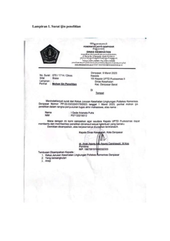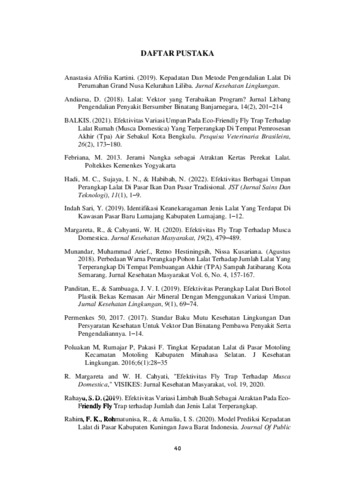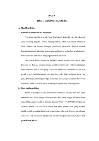 PENGARUH ATRAKTAN LIMBAH IKAN PADA FLY TRAP SEBAGAI PENURUNAN KEPADATAN LALAT DI PASAR TRADISIONAL SRIKERTHI DESA PADANGSAMBIAN KELOD TAHUN 2023 ABSTRAK Lalat merupakan serangga penular beberapa penyakit bagi manusia, penyakit tersebut berupa infeksi saluran pencernaan. Salah satu cara untuk mengendalikan kepadatan lalat dengan menggunakan fly trap dengan penambahan atraktan limbah ikan. Dengan tujuan untuk mengetahui pengaruh penambahan atraktan limbah ikan pada fly trap sebagai penurunan kepadatan lalat. Metode penelitian ini adalah jenis penelitian Pra Experiment dengan model desain One Group Pre Test Post Test Control, dengan analisis data Paired T-Test. Hasil menunjukan ada pengaruh penambahan atraktan limbah ikan pada fly trap sebagai penurunan kepadatan lalat. Berdasarkan hasil uji Paired t-test diperoleh t hitung yaitu 3.586 serta nilai sig sebesar (0,006) < alpha = (0,05). Dari hasil penelitian dimana pemeriksaan jumlah kepadatan lalat yang dilakukan pada hari senin sebelum dilakukan pemasangan fly trap (pre test) yang tertinggi adalah pada titik I sebesar 8 ekor berkategori tinggi dan terendah adalah pada titik IX, X sebesar 2 ekor berkategori rendah, sedangkan hari jumat setelah pemasangan fly trap (post test) yang tertinggi adalah pada titik II sebesar 4 ekor berkategori sedang dan terendah adalah pada titik VII,IX,X sebesar 1 ekor berkategori rendah. Dapat disimpulkan ada pengaruh penambahan atraktan limbah ikan pada fly trap sebagai penurunan kepadatan lalat. Perlu dilakukan pengembangan penelitian lanjutan menguji perbandingan. Kata Kunci : Atraktan, Fly trap, Lalat, Kepadatan lalat. THE EFFECT OF FISH WASTE ATTRACTANTS ON FLY TRAPS AS A DECREASE IN FLY DENSITY AT SRIKERTHI TRADITIONAL MARKET, PADANGSAMBIAN KELOD VILLAGE YEAR 2023 ABSTRACT Flies are insects transmit several diseases to human. One way to control fly density to use fly traps with the addition of fish. With the aim to determine the effect adding fish waste attractants to the fly trap as decrease in fly density. This method type of Pre Experiment with One Group Pre Test Post Test Control, with Paired T-Test data analysis. The results showed the effect of adding fish waste attractants to the fly trap as a decrease in fly density. Based on results of the Paired t-test, count of 3.586, sig value (0.006) < alpha = (0.05). The results of the study where the examination fly densities carried out on Monday before the installation of the fly trap (pre test) the highest was at point I of 8 heads ofhigh category and the lowest at point IX, X of 2 tails in low category, while Friday after installation The highest fly trap (post test) is at point II of 4 tails of medium category and the lowest is at points VII, IX, X of 1 tail oflow category. Concluded that the effect of adding fish waste attractants to the fly trap as a decrease in fly density. It is necessary to develop advanced research testing comparisons. Keywords : Attractant, Fly trap, Flies, Fly density