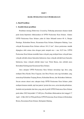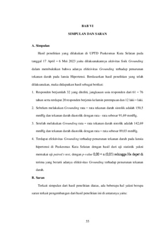 THE EFFECTIVENESS OF GROUNDING IN LOWERING BLOOD PRESSURE IN ELDERLY HYPERTENSION AT THE SOUTH KUTA HEALTH CENTER ABSTRACT Hypertension is one of the global targets for non-communicable diseases that are being sought to be reduced with a prevalence of 33% from 2010 to 2030. Prevention of hypertension can be done by means of pharmacological and non-pharmacological treatments. Pharmacological treatment is treatment that uses antihypertensive drugs. One of the non-pharmacological treatments is doing physical activity in the form of walking barefoot or it can be called Grounding for 30 minutes. The aim of this research is to know the effectiveness of Grounding on reducing blood pressure in elderly hypertension at the South Kuta Health Center. The type of research used is pre-experimental with One Group Pretest-Postest Design. The sampling technique used is probability sampling with simple random sampling and a sample size of 32 respondents. 12 respondents were male and 20 female respondents. The age range of the respondents is 61-76 years with a standard deviation of 3.58. The average reduction in systolic and diastolic blood pressure was 7.81 mmHg and 2.66 mmHg. The results of the paired t-test parametric statistical tests were obtained p-value, 0.00 < 0.05 (alpha) which means there is effectiveness Grounding on reducing blood pressure in elderly hypertension at the South Kuta Health Center. Based on the results of the research above, it is suggested activity Grounding can be used as a non-pharmacological therapy to decrease blood pressure. Keywords: Grounding; hypertension; blood pressure EFEKTIVITAS GROUNDING TERHADAP PENURUNAN TEKANAN DARAH PADA LANSIA HIPERTENSI DI PUSKESMAS KUTA SELATAN ABSTRAK Hipertensi merupakan salah satu target global penyakit tidak menular yang diusahakan untuk diturunkan dengan prevalensi 33% dari tahun 2010 sampai dengan 2030. Pencegahan hipertensi dapat dilakukan dengan cara pengobatan farmakologi dan non farmakologi. Pengobatan farmakologi adalah pengobatan yang menggunakan obat anti hipertensi. Pengobatan non farmakologi salah satunya adalah melakukan aktivitas fisik berupa berjalan tanpa alas kaki atau bisa disebut juga Grounding selama 30 menit. Tujuan dari penelitian ini untuk mengetahui efektivitas Grounding terhadap penurunan tekanan darah pada lansia hipertensi di Puskesmas Kuta Selatan. Jenis penelitian yang digunakan adalah pre-eksperimental dengan One Group Pretest-Postest Design. Teknik sampling yang digunakan adalah probability sampling dengan simple random sampling serta besaran sampel sebanyak 32 responden. 12 responden berjenis kelamin laki – laki dan 20 responden perempuan. Rentang usia responden yaitu 61 – 76 tahun dengan standar deviasi 3,58. Rata – rata penurunan tekanan darah sistolik dan diastolik adalah 7,81 mmHg dan 2,66 mmHg. Hasil uji statistik parametrik paired t-test didapatkan p-value, 0,00 < 0,05 (alpha) yang berarti Grounding efektif terhadap penurunan tekanan darah pada lansia hipertensi di Puskesmas Kuta Selatan. Berdasarkan hasil penelitian diatas maka disarankan aktivitas Grounding dapat dijadikan sebagai terapi non farmakologi untuk menurunkan tekanan darah. Kata kunci: Grounding; hipertensi; tekanan darah