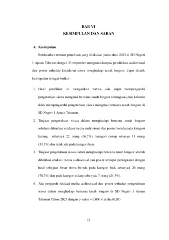 The Effect of Educational Audiovisual Media and Posters on Students' Knowledge in Facing Landslide Disasters in SD Negeri 1 Apuan Tabanan in 2023 ABSTRACT Landslide disaster is an event that threatens human life caused by the movement of soil material through an inclined surface. School-age children are often the biggest victims in any disaster incident because of their inability to protect themselves. Efforts to reduce this impact are by providing education on landslide disaster knowledge through audiovisual media and posters related to knowledge in dealing with landslide disasters. This study aims to determine the effect of giving audiovisual education and posters on students' knowledge in dealing with landslide disasters. The type of research is Pre-Experimental design with the design used is one-group pre-post design using probability sampling. The number of samples used were 33 people. The results showed that students' knowledge before being given education on audiovisual media and posters was mostly in the less category, 22 people (66.7%) and after being given it showed an increase in knowledge of 26 people (78.8%). The results of this study were tested with the Wilcoxon statistical test, obtained p-value = 0.000 < alpha (0.05), it can be concluded that there is an effect of providing audiovisual education and posters in dealing with landslides at SD Negeri 1 Apuan Tabanan. It is suggested to teachers at school to increase the provision of disaster material by developing other media. Keywords: Landslide Disaster, Student Knowledge, Audiovisual Education and Posters Pengaruh Edukasi Media Audiovisual dan Poster terhadap Pengetahuan Siswa dalam Menghadapi Bencana Tanah Longsor di SD Negeri 1 Apuan Tabanan Tahun 2023 ABSTRAK Bencana tanah longsor adalah suatu peristiwa yang mengancam kehidupan manusia yang disebabkan oleh pergerakan material tanah melalui permukaan bidang miring. Anak usia sekolah sering kali menjadi korban terbesar dalam setiap kejadian bencana karena ketidakmampuannya melindungi diri.Upaya mengurangi dampak tersebut dengan memberikan edukasi pengetahuan bencana tanah longsor melalui media audiovisual dan poster terkait dengan pengetahuan dalam menghadapi bencana tanah longsor.Penelitian ini bertujuan untuk mengetahui adanya pengaruh pemberian edukasi audiovisual dan poster terhadap pengetahuan siswa dalam menghadapi bencana tanah longsor. Jenis penelitian adalah Pre-Experimental design dengan rancangan yang digunakan yaitu one-grup pre-post design menggunakan probability sampling. Jumlah sampel yang digunakan sebanyak 33 orang. Hasil penelitian menunjukan pengetahuan siswa sebelum diberikan edukasi media audiovisual dan poster paling banyak pada kategori kurang 22 orang (66.7%)dan setelah diberikan menunjukan adanya peningkatan pengetahuan sebanyak 26 orang (78.8%). Hasil penelitian ini diuji dengan uji statistik Wilcoxon, didapatkan nilai p-value =0,000< alpha (0,05), dapat disimpulkan bahwa ada pengaruh pemberian edukasi audiovisual dan poster dalam menghadapi bencana tanah longsor di SD Negeri 1 Apuan Tabanan. Disarankan kepada guru disekolah untuk meningkatkan pemberian materi kebencanaan dengan mengembangkan media lainnya. Kata Kunci : Bencana Tanah Longosr, Pengetahuan siswa, Edukasi Audiovisual dan Poster