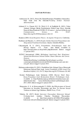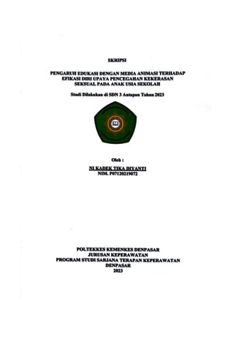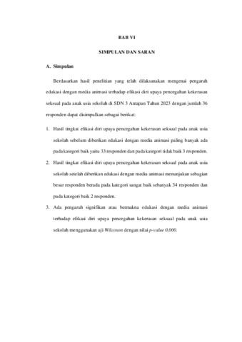 THE EFFECT OF EDUCATION WITH ANIMATION MEDIA ON VIOLENCE PREVENTION EFFORTS SELF-EFFICIENCY SEXUAL IN SCHOOL AGE CHILDREN AT SDN 3 ANTAPAN 2023 ABSTRACT Sexual violence can destroy psychosocial, growth and development of children in the future. Sexual violence is any behavior that is carried out by targeting someone sexuality or sexual organ without consent. The study aims to understand the influence of education with animated media on the self-efficacy of sexual violence prevention efforts among schoolchildren. This type of research uses pre-experimental designs with one-group pre-test and post-test designs using probability sampling with total sampler techniques. The sample was used by 38 people. The results of this study were tested with Wilcoxon's statistical test and obtained a p-value of 0.000 < alpha (0,05). It can be concluded that there is an influence of education with animated media on the self-efficacy of sexual violence prevention efforts in school-age children in the 3rd stage. The research results could be used as a guide for teachers to provide sexual education to other students by using the same media. Keywords: Sexual Violence; Self Efficacy; Animation PENGARUH EDUKASI DENGAN MEDIA ANIMASI TERHADAP EFIKASI DIRI UPAYA PENCEGAHAN KEKERASAN SEKSUAL PADA ANAK USIA SEKOLAH DI SDN 3 ANTAPAN TAHUN 2023 ABSTRAK Kekerasan seksual dapat menghancurkan psikososial, pertumbuhan dan perkembangan anak di masa depan. Kekerasan seksual segala perilaku yang dilakukan dengan menyasar seksualitas atau organ seksual seseorang tanpa persetujuan. Penelitian ini bertujuan mengetahui adanya pengaruh edukasi dengan media animasi terhadap efikasi diri upaya pencegahan kekerasan seksual pada anak sekolah. Jenis penelitian ini pre-experimental designs dengan rancangan one grup pre-test post-test design menggunakan probability sampling dengan teknik total sampling. Jumlah sampel yang digunakan sebanyak 38 orang. Hasil penelitian ini diuji dengan uji statistik Wilcoxon, didapatkan nilai p-value 0,000 <alpha (0,05), dapat disimpulkan bahwa ada pengaruh edukasi dengan media animasi terhadap efikasi diri upaya pencegahan kekerasan seksual pada anak usia sekolah di SDN 3 Antapan. Hasil penelitian ini dapat digunakan sebagai pedoman kepada guru untuk memberikan edukasi seksual bagi siswa lain dengan mengembangkan media yang sama. Kata Kunci : Kekerasan Seksual; Efikasi Diri; Animasi