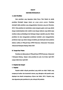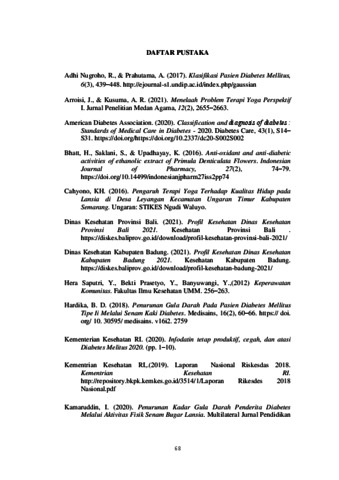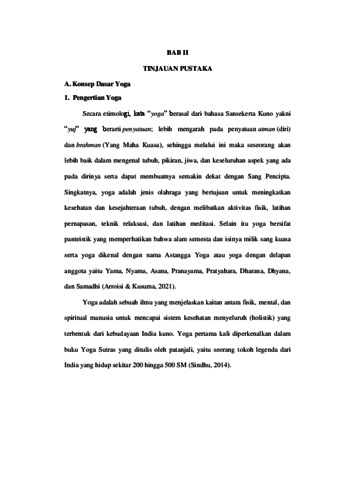 DESCRIPTION OF GIVING YOGA THERAPY IN MAINTAINING BLOOD SUGAR STABILITY IN ELDERLY WITH DIABETES MELLITUS IN THE WORK AREA OF ABIANSEMAL I PUSKESMAS ABIANSEMAL I DISTRICT ABIANSEMAL DISTRICT, BADUNG DISTRICT, 2023 ABSTRACT Diabetes mellitus is a health problem throughout the world every year its prevalence continues to increase, diabetes mellitus is often not realized by sufferers because it does not give typical symptoms in the early period, which is usually caused by impaired insulin production by beta Langerhans cells of the pancreas gland or caused by a lack of responsiveness of the body's cells to insulin. This study aims to describe the administration of yoga therapy in maintaining stable blood sugar in elderly people with diabetes mellitus in the Working Area of UPTD Puskemas Abiansemal I Abiansmal District, Badung Regency in 2023. The type of research used is descriptive with a qualitative approach. The sampling technique used in this study was to use the slovin formula with 50 research samples. The results of this study were that the majority of respondents aged 60-69 years were 34 people (70.8%), female sex were 30 people (59.5%), had elementary school education of 22 people (44.5%), and worked in agricultural sector as many as 14 people (28.0%). The results of blood sugar levels after the administration of yoga therapy obtained as many as 12 people (66.0%) experienced a decrease in blood sugar levels in the stable category and found as many as 38 people (76.0%) experienced a decrease in blood sugar levels in the category of still high or still unstable . This yoga therapy can be given to help increase blood flow to the muscles which stimulates pancreatic function and increases the secretion of receptors on insulin which can help lower blood sugar levels. Keywords: yoga therapy, elderly, diabetes mellitus GAMBARAN PEMEBERIAN TERAPI YOGA DALAM MENJAGA KESTABILAN GULA DARAH PADA LANSIA PENDERITA DIABETES MELLITUS DI WILAYAH KERJA UPTD PUSKESMAS ABIANSEMAL I KECAMATAN ABIANSEMAL KABUPATEN BADUNG TAHUN 2023 ABSTRAK Diabetes mellitus menjadi masalah kesehatan di seuruh dunia setiap tahun prevelensinya terus meningkat, Diabetes mellitus sering tidak di sadari oleh penderitanya karena tidak memberikan gejala yang khas pada periode awal, yang bisanya disebabkan oleh ganguan produksi insulin oleh sel beta langerhans kelenjar pancreas atau disebabkan oleh kurang responsifnya sel tubuh terhatap insulin. Pnelitian ini bertujuan untuk menggambarkan pemberian terapi yoga dalam menjaga kestabilan gula darah pada lansia penderita diabetes mellitus di Wilayah Kerja UPTD Puskemas Abiansemal I Kecamatan Abiansmal Kabupaten Badung Tahun 2023. Jenis penelitian yang digunakan deskriptif dengan pendekatan kualitatif. Teknik pengambilan sampel yang digunakan dalam penelitian ini adalah dengan menggunkan rumus slovin dengan 50 sampel penelitian. Hasil penelitian ini yaitu mayoritas responden berusia 60-69 tahun sebanyak 34 orang (70,8%) , berjenis kelamin perempuan sebanyak 30 orang (59,5%), berpendidikan Sekolah Dasar sebanyak 22 orang (44,5%), dan berkerja di sektor pertanian sebanyak 14 orang (28,0%). Hasil kadar gula darah setelah pemberian terapi yoga diperoleh sebanyak 12 orang (66,0%) mengalami penurunan kadar gula darah dengan kategori stabil dan ditemukan sebanyak 38 orang (76,0%) mengalami penurunan kadar gula darah dengan kategori masih tinggi atau masih tidak stabil. Terapi yoga ini dapat diberikan untuk membantu peningkatan aliran darah ke otot yang merangsang fungsi pankreas dan peningkatan sekresi reseptor pada insulin yang dapat membantu menurunkan kadar gula darah. Kata kunci : terapi yoga, lansia, diabetes mellitus