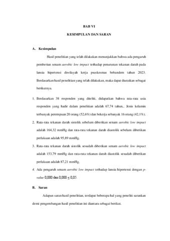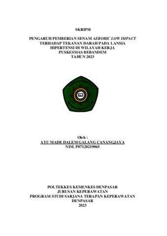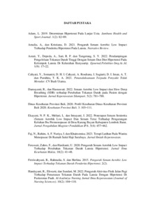 THE EFFECT OF GIVING LOW IMPACT AEROBIC GYMNASTICS ON BLOOD PRESSURE IN HYPERTENSIVE ELDERLY AT WORKING AREA PUSKESMAS BEBANDEM IN 2023 ABSTRACT Hypertension is blood pressure that exceeds normal limits with systolic ≥ 140 mmHg and diastolic ≥ 90 mmHg. One of the efforts that can be made to lower blood pressure is to do low impact aerobic exercise which is a light exercise that can be applied by elderly hypertensives and can improve blood circulation in the body. The purpose of this study was to find out the effect of giving low impact aerobic gymnastics on blood pressure in hypertensive elderly at working area puskesmas bebandem in 2023. Jenis penelitian ini adalah pre-experimental dengan one group pre test-post test design. This study used a purposive sampling method with 38 respondents according to the inclusion criteria, namely hypertensive elderly who were willing to be respondents, hypertensive elderly aged 60-74 years, hypertensive elderly who live in jungutan village and exclusion criteria, hypertensive elderly with disabilities, hypertensive elderly who are not present once during the study cannot be used as a respondent. This research was conducted 6 times in 2 weeks for 20 minutes. The results showed that the average systolic blood pressure before being given low impact aerobic was 164.32 mmHg and the diastolic before being given low impact aerobic was 95.89 mmHg and the average systolic blood pressure after being given aerobic low impact was 153.79 mmHg and diastolic after being given low impact aerobic was 87.21 mmHg. Test the hypothesis using the paired t-test and the results obtained are a systolic p value of 0.000 (p value <0.005) and a diastolic p value of 0.000 (p value <0.05). So it can be concluded that there is an the effect of giving low impact aerobic gymnastics on blood pressure in hypertensive elderly at working area puskesmas bebandem in 2023. Based on this, it is hoped that low impact aerobic exercise can be applied as a non-pharmacological treatment to reduce blood pressure. Keywords : low impact aerobic; blood pressure; elderly PENGARUH PEMBERIAN SENAM AEROBIC LOW IMPACT TERHADAP TEKANAN DARAH PADA LANSIA HIPERTENSI DIWILAYAH KERJA PUSKESMAS BEBANDEM TAHUN 2023 ABSTRAK Hipertensi merupakan tekanan darah yang melebihi batas normal dengan sistolik ≥ 140 mmHg dan diastolik ≥ 90 mmHg. Salah satu upaya yang dapat dilakukan untuk menurunkan tekanan darah adalah dengan melakukan senam aerobic low impact yang merupakan olahraga ringan yang dapat diterapkan oleh lansia hipertensi dan dapat memperlancar peredaran darah didalam tubuh. Penelitian ini bertujuan untuk mengetahui pengaruh pemberian senam aerobic low impact terhadap tekanan darah pada lansia hipertensi diwilayah kerja Puskesmas Bebandem Tahun 2023. Jenis penelitian ini adalah pre-experimental dengan one group pre test-post test design. Penelitian ini menggunakan metode purposive sampling dengan responden 38 orang sesuai kriteria inklusi, yaitu lansia hipertensi yang bersedia menjadi responden, lansia hipertensi yang berusia 60-74 tahun, lansia hipertensi yang berdomisili Desa Jungutan dan kriteria eksklusi, yaitu lansia hipertensi yang dengan disabilitas, lansia hipertensi yang tidak hadir satu kali saat penelitian sudah tidak bisa dijadikan responden. Penelitian ini dilakukan sebanyak 6 kali dalam 2 minggu selama 20 menit. Hasil penelitian menunjukkan rata-rata tekanan darah sistolik sebelum diberikan senam aerobic low impact 164,32 mmHg dan diastolik sebelum diberikan senam aerobic low impact 95,89 mmHg dan rata-rata tekanan darah sistolik sesudah diberikan senam aerobic low impact 153,79 mmHg dan diastolik sesudah diberikan senam aerobic low impact 87,21 mmHg. Uji hipotesis dengan menggunakan uji paired t-test dan diperoleh hasil sistolik p value 0,000 (p value < 0,005) dan diastolik p value 0,000 (p value < 0,05). Sehingga, dapat disimpulkan ada pengaruh pemberian senam aerobic low impact terhadap tekanan darah pada lansia diwilayah kerja Puskesmas Bebandem Tahun 2023. Berdasarkan hal tersebut, diharapkan senam aerobic low impact bisa diterapkan sebagai pengobatan non farmakologi untuk menurunakan tekanan darah. Kata Kunci: lansia; senam aerobic low impact; tekanan darah