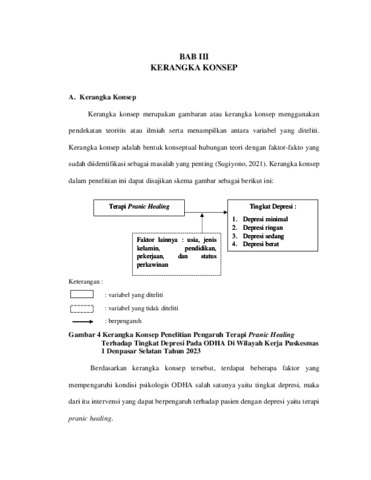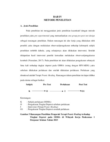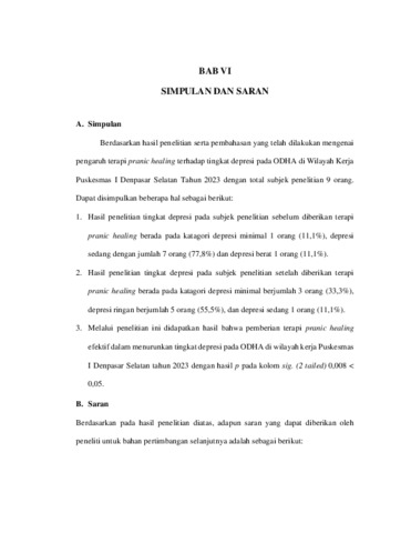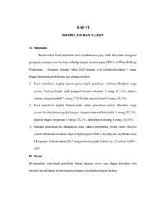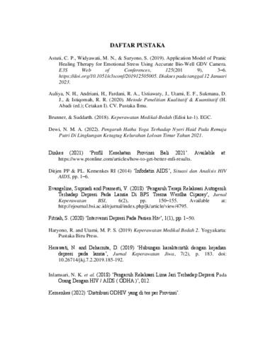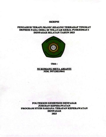 The Effect of Pranic Healing Therapy on the Level of Depression with ODHA in the Working Area of Puskesmas I South Denpasar in 2023 ABSTRACT HIV / AIDS virus that attacks the immune system which makes a person more susceptible to other infections that cause ODHA to experience psychological problems, one of which is depression due to the disease he is experiencing. ODHA is not only physically disturbed but also at risk of experiencing psychological disorders such as depression which can affect the recovery of ODHA. The purpose of this study was to determine the effect of pranic healing therapy on the level of depression in ODHA in the Working Area of Puskesmas I South Denpasar in 2023. This research design uses pre-experimental with a one-group pre-post test design approach. The sampling technique is non-probability with purposive sampling. The number of research subjects was 9 people. Data collection was carried out using the Beck Depression Inventory (BDI) instrument. Test the hypothesis using the Wilcoxon Rank Test. The results of this study showed that before being given pranic healing therapy, some respondents experienced depression at least as many as 1 person (11.1%), moderate depression as many as 7 people (77.8%), and major depression 1 person (11.1%). After being given treatment, the level of depression decreased namely depression at least as many as 3 people (33.3%), mild depression as many as 5 people (55.5%), and 1 person (11.1%) experienced moderate depression. After analysis, the p-value was 0.008 < alpha 0.05. It was concluded that there is an effect of pranic healing therapy on the level of depression in ODHA in the Working Area of Puskesmas I South Denpasar in 2023 Keywords: pranic healing therapy, depression, ODHA Pengaruh Terapi Pranic Healing Terhadap Tingkat Depresi padan ODHA di Wilayah Kerja Puskesmas I Denpasar Selatan Tahun 2023 ABSTRAK HIV/AIDS virus yang menyerang sistem kekebalan tubuh yang membuat seseorang lebih mudah terkena infeksi lainnya yang menyebabkan ODHA mengalami masalah psikologis salah satunya yaitu depresi akibat penyakit yang dialaminya. ODHA bukan hanya terganggu secara fisik melainkan juga berisiko mengalami gangguan psikologis seperti depresi yang mampu mempengaruhi kesembuhan ODHA. Tujuan penelitian ini adalah untuk mengetahui pengaruh terapi pranic healing terhadap tingkat depresi pada ODHA di Wilayah Kerja Puskesmas I Denpasar Selatan Tahun 2023. Rancangan penelitian ini menggunakan pre-eksperimental dengan pendekatan one-group pre-post test design. Teknik pengambilan sampel adalah non-probability dengan jenis purposive sampling. Jumlah subjek penelitian sebanyak 9 orang. Pengumpulan data dilakukan dengan menggunakan instrument Beck Depression Inventory (BDI). Uji hipotesis menggunakan Wilcoxon Rank Test. Hasil penelitian ini menunjukkan sebelum diberikan terapi pranic healing sebagian responden mengalami depresi minimal sebanyak 1 orang (11,1%), depresi sedang sebanyak 7 orang (77,8%), dan depresi berat 1 orang (11,1%). Setelah diberikan perlakuan tingkat depresi mengalami penurunan yaitu depresi minimal sebanyak 3 orang (33,3%), depresi ringan sebanyak 5 orang (55,5%), dan 1 orang (11,1%) mengalami depresi sedang. Setelah dianalisis didapatkan p- value 0,008 < alpha 0,05. Disimpulkan bahwa ada pengaruh terapi pranic healing terhadap tingkat depresi pada ODHA di Wilayah Kerja Puskesmas I Denpasar Selatan Tahun 2023 Kata kunci: terapi pranic healing, depresi, ODHA