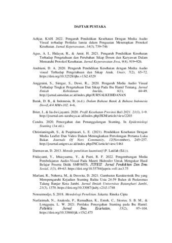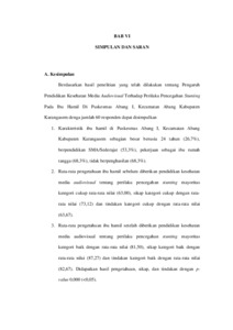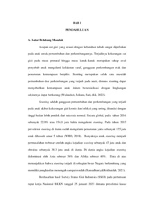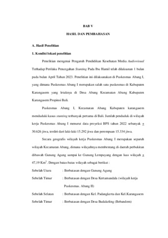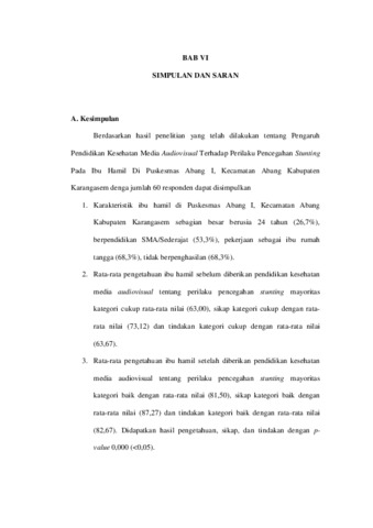 THE INFLUENCE OF HEALTH EDUCATION AUDIOVISUAL MEDIA ON STUNTING PREVENTION BEHAVIOR IN PREGNANT WOMEN AT ABANG I PUSKESMAS, ABANG DISTRICT, KARANGASEM DISTRICT, 2023 ABSTRACK Stunting is a growth and development disorder that occurs in children due to chronic malnutrition and infection which is often characterized by shorter than average height. In the world, the incidence of stunting is dominated by Asia at 54% and Africa at 40%. The purpose of this study was to determine the effect of audiovisual media health education on stunting prevention behavior in pregnant women at the Abang I Health Center, Abang District, Karangasem Regency in 2023. This research method used a pre-experimental type of one group pre -post test design. Sampling using non-probability sampling technique with purposive sampling technique with a large sample of 60 respondents. This study used a Guttman scale questionnaire on the knowledge and action sub-variables while for the attitude sub-variables used the Likert scale. The normality test uses the Kormogolov-Smirnov test, the hypothesis test uses the Wilcoxon Signed Test Rank. The research results obtained the results of the p-value at sig. (2-tailed) = 0.000 < alpha (0.05). The conclusion is that there is an influence of audiovisual media health education on stunting prevention behavior in pregnant women at the Abang I Health Center, Abang District, Karangasem Regency in 2023. Suggestions Pregnant women are expected to be able to prevent stunting, namely from during pregnancy, especially since the First 1000 Days of Life (HPK), including by increasing mother's knowledge about the attitude and behavior of a mother in preventing stunting. Keywords: Audiovisual media, stunting prevention behavior PENGARUH PENDIDIKAN KESEHATAN MEDIA AUDIOVISUAL TERHADAP PERILAKU PENCEGAHAN STUNTING PADA IBU HAMIL DI PUSKESMAS ABANG I, KECAMATAN ABANG KABUPATEN KARANGASEM TAHUN 2023 ABSTRAK Stunting adalah gangguan pertumbuhan dan perkembangan yang terjadi pada anak akibat kukurangan gizi kronis dan infeksi yang sering, ditandai dengan tinggi badan lebih pendek dari rata-rata normal. Di dunia angka kejadian stunting didominasi oleh Asia sebesar 54% dan Afrika sebesar 40%. Tujuan penelitian ini untuk mengetahui pengaruh pendidikan kesehatan media audiovisual terhadap perilaku pencegahan stunting pada ibu hamil di Puskesmas Abang I, Kecamatan Abang Kabupaten Karangasem Tahun 2023. Metode penelitian ini menggunakan pre experimental berjenis one group pre-post test design. Pengambilan sampel dengan teknik non-probability sampling dengan teknik purposive sampling dengan besar sampel 60 responden. Penelitian ini menggunakan kuesioner skala guttman pada sub variabel pengetahuan dan tindakan sedangkan untuk sub variabel sikap menggunakan skala likert. Uji normalitas menggunakan uji kormogolov-smirnov, uji hipotesis menggunakan Wilcoxon Signed Test Rank. Hasil penelitian didapatkan hasil nilai p-value pada sig. (2-tailed) = 0,000 < alpha (0,05).Kesimpulannya terdapat pengaruh pendidikan kesehatan media audiovisual terhadap perilaku pencegahan stunting pada ibu hamil di Puskesmas Abang I, Kecamatan Abang Kabupaten Karangasem tahun 2023. Saran Ibu hamil diharapkan dapat melakukan Pencegahan stunting yaitu dari masa kehamilan terutama sejak 1000 Hari Pertama Kehidupan (HPK) diantaranya dengan meningkatkan pengetahuan ibu tentang sikap dan perilaku seorang ibu dalam mencegah stunting. Kata Kunci : Media audiovisual, perilaku pencegahan stunting