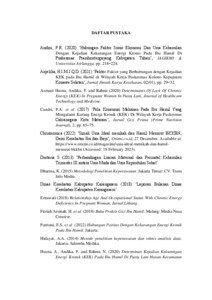 THE RELATIONSHIP BETWEEN AGE AND BIRTH SPACING WITH THE INCIDENCE OF CHRONIC ENERGY DEFICIENCY (CED) IN PREGNANT WOMEN IN 2023 ABSTRACT Chronic energy deficiency (CED) in pregnant women is a problem of malnutrition due to a long-lasting (chronic) lack of energy with the emergence of various health problems in pregnant women. CED pregnant women are pregnant women with a history of energy deficiency (CED) which is characterized by an upper arm circumference (LILA) < 23.5 cm. Factors that affect chronic energy deficiency (CED) in pregnant women include age and the distance between the birth of the previous child and the current pregnancy. This study aims to determine the relationship between age and birth spacing with the incidence of Chronic Energy Deficiency (CED) in pregnant women in the Work Area of the Selat Health Center, Rendang Health Center, and Sidemen Health Center. The research method in this research is quantitative with a correlation analytic research design using a cross sectional approach. The sampling technique used a total sampling of 40 people. Data collection uses primary data with a questionnaire sheet. The results showed that the majority (90%) of CED pregnant women were aged between 20-35 years as many as 36 people. Chi-Square test results showed the age of pregnant women with CED (p value = 0,861) (α > 0.05) and birth spacing (p value = 0.033) (< 0.05), so there was not significant relationship between age, while there is a relationship birth spacing the incidence of KEK in pregnant women in the Working Area of the Selat Health Center, Rendang Health Center and Sidemen Health Center. Keywords: incidence of CED; age of pregnant women; birth spacing HUBUNGAN USIA DAN JARAK KELAHIRAN DENGAN KEJADIAN KEKURANGAN ENERGI KRONIK (KEK) PADA IBU HAMIL TAHUN 2023 ABSTRAK Kekurangan energi kronik (KEK) pada ibu hamil adalah masalah kurangnya gizi akibat dari kekurangan energi yang berlangsung dalam jangka waktu lama (kronik) dengan berbagai timbulnya gangguan kesehatan pada ibu hamil. Ibu hamil KEK adalah ibu hamil dengan kurang energi kronik (KEK) ditandai dengan ukuran Lingkar Lengan Atas (LILA) <23,5 cm. Faktor yang mempengaruhi kekurangan energi kronik (KEK) pada ibu hamil diantaranya usia dan jarak kelahiran anak sebelumnya dengan kehamilan saat ini. Penelitian ini bertujuan untuk mengetahui hubungan usia dan jarak kelahiran dengan kejadian kekurangan energi kronik (KEK) pada ibu hamil di Wilayah Kerja Puskesmas Selat Puskesmas Rendang, dan Puskesmas Sidemen. Metode penelitian dalam penelitian ini yaitu kuantitatif dengan desain penelitian analitik korelasi menggunakan pendekatan cross sectional. Teknik pengambilan sampel menggunakan total sampling sebanyak 85 orang dan yang mengalami KEK sebanyak 40 orang. Pengumpulan data menggunakan data primer dengan lembar kuesioner. Hasil penelitian didapatkan mayoritas (90%) usia ibu hamil KEK antara 20-35 tahun sebanyak 36 orang, jarak kelahiran anak sebelumnya dengan kehamilan saat ini mayoritas (67,5%) dengan jarak kelahiran <2 tahun dan >3 tahun sebanyak 27 orang. Hasil uji Chi-Square menunjukkan usia ibu hamil KEK (p value=0,861) (α>0,05) dan jarak kelahiran (p value=0,033) (<0,05), maka dapat disimpulkan tidak terdapat hubungan yang bermakna antara usia dan terdapat hubungan bermakna jarak kelahiran dengan kejadian KEK pada ibu hamil di Wilayah Kerja Puskesmas Selat, Puskesmas Rendang, dan Puskesmas Sidemen. Kata kunci: kejadian KEK; usia ibu hamil; jarak kelahiran