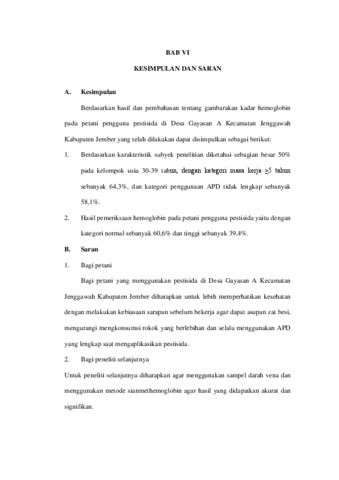 DESCRIPTION OF HEMOGLOBIN LEVELS IN PESTICIDE USING FARMERS IN GAYASAN A VILLAGE JENGGAWAH DISTRICT JEMBER DISTRICT ABSTRACT Background: Pesticides are chemical substances used to kill pests. Exposure of the body to pesticides will have a very toxic impact or even result in death. This happens because there is a high sulfur content in pesticides which can cause sulfhemoglobin bonds, where sulfhemoglobin is a form of hemoglobin attached to the sulfur atom in it so that red blood cells can cause a decrease in hemoglobin resulting in hemolytic anemia. Purpose: The purpose of this study is to first identify the use of PPE and the duration of use of pesticides, and the second to measure the results of examining hemoglobin levels in farmers in Gayasan A Village, Jenggawah District, Jember Regency, based on the characteristics of the usta group, duration of use of pesticides, and use of PPE. Method: This type of descriptive research was conducted in February 2023 in Gayasan A Village, Jenggawah District, Jember Regency. The sample of this study was 33 people using the Simple Random Sampling technique using the POCT method with the Easy Touch GCU tool. Results: The results of this study showed normal hemoglobin levels in 20 people (60.6%) and high hemoglobin levels in 13 people (39.4%) Conclusion: The conclusion in this study is that most (50%) are in the age group 30-39 years, with the category of working age > 5 years (64.3%), and the category of incomplete use of PPE (58.19%) Keywords: Hemoglobin levels, Farmers using pesticides and POCT GAMBARAN KADAR HEMOGLOBIN PADA PETANI PENGGUNA PESTISIDA DI DESA GAYASAN A KECAMATAN JENGGAWAH KABUPATEN JEMBER ABSTRAK Latar belakang: Pestisida merupakan zat kimia yang dipakai untuk membunuh hama. Terpaparnya tubuh dari pestisida akan berdampak sangat toksik atau bahkan mengakibatkan kematian. Hal ini terjadi karena terdapat kandungan sulfur yang tinggi dalam pestisida yang dapat menimbulkan ikatan sulfhemoglobin, dimana sulfhemoglobin merupakan bentuk hemoglobin yang berikatan dengan atom sulfur didalamnya sehingga pada sel darah merah dapat menyebabkan penurunan hemoglobin sehingga terjadi anemia hemolitik. Tujuan: Tujuan pada penelitian ini yang pertama untuk mengidentifikasi penggunaan APD dan lama penggunaan pestisida yang ke dua untuk mengukur hasil pemeriksaan kadar hemoglobin pada petani di Desa Gayasan A Kecamatan Jenggawah Kabupaten Jember bedasarkan karakteristik kelompok usia, lama penggunaan pestisida, penggunaan APD. Metode: Jenis penelitian deskriptif yang dilakukan pada bulan Februari 2023 di Desa Gayasan A Kecamatan Jenggawah Kabupaten Jember. Sampel penelitian ini berjumlah 33 orang menggunakan teknik sampling Simpel Rondom Sampling menggunakan metode POCT dengan alat Easy Touch GCU. Hasil: Hasil penelitian ini menunjukkan kadar hemoglobin normal sebanyak 20 orang (60,6%) dan kadar hemoglobin tinggi sebanyak 13 orang (39,4%) Kesimpulan: Kesimpulan pada penelitian ini penelitian ini diketahui sebagian besar (50%) pada kelompok usia 30-39 tahun, dengan kategori masa kerja ≥5 tahun sebanyak (64,3%), dan kategori penggunaan APD tidak lengkap sebanyak (58,1%) Kata kuci: Kadar hemoglobin, Petani pengguna pestisida dan POCT