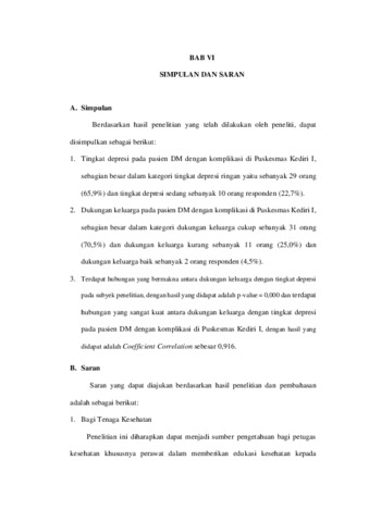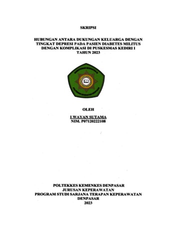 CORRELATION OF FAMILY SUPPORT WITH THE LEVEL OF DEPRESSION IN DIABETES WITH COMPLICATIONS AT THE PUBLIC HEALTHCARE CENTER KEDIRI I YEAR 2023 ABSTRACT Background: Diabetes millitus (DM) is a chronic disease that can affect the psychological condition of patients, one of which is depression. Family support is very necessary in providing support to patients. Objective: This study aims to prove the relationship between family support and the level of depression in DM patients with complications. Method: using a descriptive correlational research design conducted at the Kediri I Health Center in January-May 2023 with a total sampling technique of 44 respondents. Data collection was obtained through the family support questionnaire and the Beck Depression Inventory-II (BDI-II) questionnaire. Data analysis test using Spearman Rank test. Results: The study showed that the characteristics of respondents were mostly male, aged 46-55 years, high school education level, and many were not working. There is a correlation between family support with a p-value at Sig.(2-tailed) = 0.000 < alpha(0.05), with a Coefficient Correlation value of 0.916. Conclusion: there is a significant relationship between family support and the level of depression of DM patients with complications at the Kediri I Health Center with a very strong level of relationship strength. With family support, family members suffering from DM with depression are motivated to undergo treatment or therapy. Keywords: diabetes millitus, level of depression, family support HUBUNGAN ANTARA DUKUNGAN KELUARGA DENGAN TINGKAT DEPRESI PADA PASIEN DIABETES MILITUS DENGAN KOMPLIKASI DI PUSKESMAS KEDIRI I TAHUN 2023 ABSTRAK Latar belakang: Diabetes millitus (DM) merupakan salah satu penyakit kronis yang dapat mempengaruhi kondisi psikologis pasien, salah satunya yaitu depresi. Dukungan keluarga sangat diperlukan dalam memberikan dukungan kepada pasien Tujuan: penelitian ini bertujuan untuk membuktikan hubungan antara dukungan keluarga dengan tingkat depresi pada pasien DM dengan komplikasi. Metode: menggunakan desain penelitian deskriptif korelasional yang dilakukan di Puskesmas Kediri I pada bulan Januari-Mei 2023 dengan teknik total sampling sebanyak 44 responden. Pengumpulan data didapatkan melalui kuesioner dukungan keluarga dan kuesioner Beck Depression Inventory–II (BDI-II). Uji Analisa data menggunakan uji Spearman Rank. Hasil: penelitian menunjukkan karakteristik responden mayoritas berjenis kelamin laki-laki, berusia 46-55 tahun, tingkat pendidikan SMA/sederajat, dan banyak yang tidak bekerja. Terdapat korelasi antara dukungan keluarga dengan nilai p-value pada Sig.(2-tailed) = 0,000 < alpha(0,05), dengan nilai Coefficient Correlation sebesar 0,916. Kesimpulan: ada hubungan signifikan antara dukungan keluarga dengan tingkat depresi pasien DM dengan komplikasi di Puskesmas Kediri I dengan tingkat kekuatan hubungan sangat kuat. Dengan dukungan keluarga, anggota keluarga yang menderita DM dengan depresi termotivasi menjalani pengobatan atau terapi. Kata Kunci : diabetes millitus, tingkat depresi, dukungan keluarga