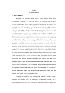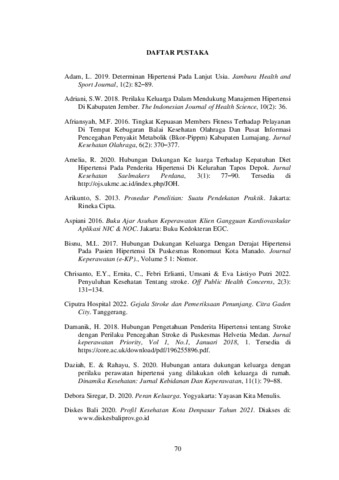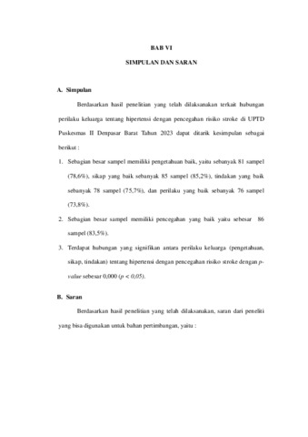 THE RELATIONSHIP BETWEEN FAMILY BEHAVIOR MAS ABOUT HYPERTENSION AND STROKE RISK PREVENTION IN UPTD PUSKESMAS II DENPASAR BARAT TAHUN 2023 ABSTRACT Hypertension is a silent killer that most people do not realize that hypertension is a problem or a warning symptom. Hypertension can cause fatigue, nausea, vomiting, confusion, anxiety, chest pain and muscle tremors. One of the contributing factors is family behavior. This study aims to determine the relationship between family behavior regarding hypertension and stroke risk prevention at UPTD Puskesmas II West Denpasar in 2023. The study design used a cross-sectional approach. The population size in this study was 138 people. The sample selection used a non-probability sampling technique, namely purposive sampling with a sample size of 103 people. Data collection using a questionnaire. This study shows that most of the samples (knowledge, attitudes, and actions) are classified as good. In addition, the prevention of stroke risk for most of the samples was good. Based on the results of the Spearman rank test, the p-value was 0.000 (p <0.05) in behavior and its three domains (knowledge, attitudes, actions) which means that there is a significant relationship between family behavior regarding hypertension and stroke risk prevention at UPTD Puskesmas II West Denpasar. In addition, the value of r or correlation coefficient of 0.744 is obtained, which means a strong correlation level. It is hoped that health workers can provide awareness and change family behavior about hypertension towards family members who suffer from hypertension and families can seek information from health workers about hypertension. Keywords: family behavior; hypertension; stroke risk prevention HUBUNGAN PERILAKU KELUARGA TENTANG HIPERTENSI DENGAN PENCEGAHAN RISIKO STROKE DI UPTD PUSKESMAS II DENPASAR BARAT TAHUN 2023 ABSTRAK Hipertensi merupakan silent killer yang kebanyakan orang tidak menyadari bahwa hipertensi adalah masalah atau gejala peringatan. Hipertensi dapat menyebabkan kelelahan, mual, muntah, kebingungan, kecemasan, nyeri dada, dan tremor otot. Salah satu faktor penyebabnya adalah perilaku keluarga. Penelitian ini bertujuan untuk mengetahui Hubungan Perilaku Keluarga Tentang Hipertensi Dengan Pencegahan Risiko Stroke di UPTD Puskesmas II Denpasar Barat Tahun 2023. Desain penelitian ini menggunakan cross sectional. Besar populasi pada penelitian ini yaitu 138 orang. Pemilihan sampel menggunakan teknik non-probability sampling yaitu Purpossive sampling dengan besar sampel sejumlah 103 orang. Pengumpulan data menggunakan kuesioner. Penelitian ini menunjukkan bahwa sebgaian besar sampel (pengetahuan, sikap, dan tindakan) tergolong baik. Selain itu, pencegahan risiko stroke sebagian besar sampel tergolong baik. Berdasarkan hasil uji rank spearman didapatkan hasil p-value sebesar 0,000 (p < 0,05) pada perilaku beserta ketiga domainnya (pengetahuan, sikap, tindakan) yang berarti ada hubungan yang signifikan antara perilaku keluarga tentang hipertensi dengan pencegahan risiko stroke di UPTD Puskesmas II Denpasar Barat. Selain itu, diperoleh nilai r atau koefisien korelasi sebesar 0,744 yang berarti tingkat korelasi kuat. Diharapkan tenaga kesehatan dapat memberikan kesadaran dan mengubah perilaku keluarga tentang hipertensi terhadap anggota keluarga yang menderita hipertensi dan keluarga dapat mencari informasi kepada petugas kesehatan tentang penyakit hipertensi. Kata kunci : perilaku keluarga; hipertensi; pencegahan risiko stroke