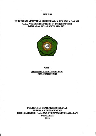 Puspitasari, Komang Ayu (2023) HUBUNGAN AKTIVITAS FISIK DENGAN TEKANAN DARAH PADA PASIEN HIPERTENSI DI PUSKESMAS III DENPASAR SELATAN TAHUN 2023. Diploma thesis, Politeknik Kesehatan Denpasar Jurusan Keperawatan 2023.