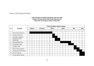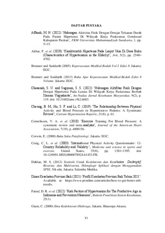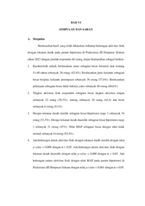 THE RELATIONSHIP BETWEEN PHYSICAL ACTIVITY AND BLOOD PRESSURE IN HYPERTENSION PATIENTS AT HEALTH CENTER III SOUTH DENPASAR IN 2023 ABSTRACT Hypertension is a state of increased blood pressure above normal where the systolic pressure is above 140 mmHg and the diastolic pressure is above 90 mmHg. The risk factors that influence hypertension are physical activity. The purpose of this study was to determine the relationship between physical activity and blood pressure in hypertensive patients at Puskesmas III South Denpasar in 2023. This research is a non-experimental quantitative study with correlation analysis using a cross sectional model. The sampling technique of this study was a type of non-probability sampling, namely a purposive sampling technique of 66 people according to the inclusion and exclusion criteria. Statistical test using the Spearman Rank correlation analysis method. The level of physical activity of the respondents was mostly light activity level as many as 32 people (58.5%), moderate as many as 28 people (42.4) and heavy as many as 6 people (9.1%). The degree of systolic blood pressure was mostly stage 2 hypertension in 34 people (51.5%). The degree of diastolic blood pressure was mostly stage 1 hypertension in 31 people (47%). Most of the MAP values with abnormal values were 61 people (92.4%). There is a relationship between physical activity and systolic blood pressure with a p-value = 0.000 with α = 0.05. There is a relationship between physical activity and diastolic blood pressure with a p-value = 0.000 with α = 0.05. There is a relationship between physical activity and MAP values in hypertensive patients at Puskesmas III South Denpasar with a p-value = 0.001 with α = 0.05. Keywords : physical activity, blood pressure, hypertension HUBUNGAN AKTIVITAS FISIK DENGAN TEKANAN DARAH PADA PASIEN HIPERTENSI DI PUSKESMAS III DENPASAR SELATAN TAHUN 2023 ABSTRAK Hipertensi adalah keadaan peningkatan tekanan darah diatas normal dimana tekanan sistolik diatas 140 mmHg dan tekanan diastolik diatas 90 mmHg. Faktor risiko yang mempengaruhi hipertensi yaitu aktivitas fisik. Tujuan penelitian ini untuk mengetahui hubungan antara aktivitas fisik dengan tekanan darah pada pasien hipertensi di Puskesmas III Denpasar Selatan tahun 2023. Penelitian ini merupakan penelitian kuantitatif non eksperimental dengan analitik korelasi menggunakan model cross sectional. Teknik sampling penelitian ini adalah jenis non probability sampling yaitu teknik purposive sampling sebanyak 66 orang sesuai kriteria inklusi dan eksklusi. Uji statistik menggunakan metode analisa korelasi Rank Spearman. Tingkat aktivitas fisik responden sebagian besar tingkat aktivitas ringan sebanyak 32 orang (58.5%), sedang sebanyak 28 orang (42,4) dan berat sebanyak 6 orang (9,1%). Derajat tekanan darah sistolik sebagian besar hipertensi stage 2 sebanyak 34 orang (51,5%). Derajat tekanan darah diastolik sebagian besar hipertensi stage 1 sebanyak 31 orang (47%). Nilai MAP sebagian besar dengan nilai tidak normal sebanyak 61orang (92,4%). Ada hubungan antara aktivitas fisik dengan tekanan darah sistolik dengan nilai p-value = 0,000 dengan α = 0,05. Ada hubungan antara aktivitas fisik dengan tekanan darah diastolik dengan nilai p-value = 0,000 dengan α = 0,05. Ada hubungan antara aktivitas fisik dengan nilai MAP pada pasien hipertensi di Puskesmas III Denpasar Selatan dengan nilai p-value = 0,001 dengan α = 0,05. Kata kunci : aktivitas fisik, tekanan darah, hipertensi