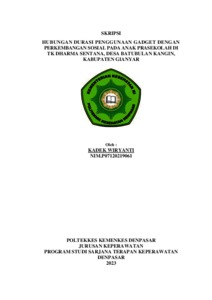 Wiryanti, Kadek (2023) HUBUNGAN DURASI PENGGUNAAN GADGET DENGAN PERKEMBANGAN SOSIAL PADA ANAK PRASEKOLAH DI TK DHARMA SENTANA, DESA BATUBULAN KANGIN, KABUPATEN GIANYAR. Diploma thesis, Poltekkes Kemenkes Denpasar Jurusan Keperawatan 2023.