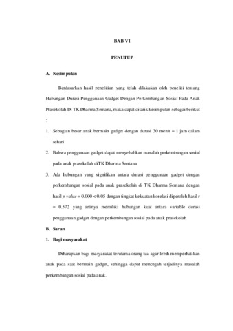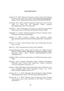 THE RELATIONSHIP BETWEEN DURATION OF GADGET USE WITH SOCIAL DEVELOPMENT IN PRESCHOOL CHILDREN AT DHARMA SENTANA KINDERGARTEN ABSTRACT Preschool is an important period in the process of human development. The speed of growth and development of each individual with the others varies, depending on the factors that influence it during the growth and development process takes place. At this time, as technology develops, there are many influences on the child's development process, one of which is the use of gadgets. The purpose of this study was to determine whether there was a relationship between the duration of gadget use and social development in preschoolers at Dharma Sentana Kindergarten. This research method is correlational which is quantitative with the approach model used is cross sectional. The sampling technique used in this study was non-probability sampling with purposive sampling, namely 94 respondents. Data collection using a questionnaire instrument. The Spearman rank statistical test obtained a p value on the duration of gadget use with social development, namely 0.000 <0.05, then Ho was rejected and Ha was accepted, that is, there was a significant relationship or correlation. The conclusion from this research is that it is expected that the community, especially parents, pay more attention to children and build good communication and interaction with children so that children can reduce excessive playing of gadgets and prevent social development problems in children. Keywords: Gadgets, Preschool Children, Social Development HUBUNGAN DURASI PENGGUNAAN GADGET DENGAN PERKEMBANGAN SOSIAL PADA ANAK PRASEKOLAH DI TK DHARMA SENTANA ABSTRAK Masa prasekolah merupakan periode penting dalam proses tumbuh kembang manusia. Kecepatan tumbuh kembang setiap individu satu dengan yang lainnya bervariasi, tergantung faktor-faktor yang mempengaruhinya selama proses tumbuh kembang itu berlangsung. Pada saat ini seiring berkembangnya teknologi, banyak sekali yang berpengaruh pada proses perkembangan anak salah satunya adalah penggunaan gadget. Tujuan dari penelitian ini untuk mengetahui adanya hubungan durasi penggunaan gadget dengan perkembangan sosial pada anak prasekolah di TK Dharma Sentana. Metode penelitian ini adalah korelasional yang bersifat kuantitatif dengan model pendekatan yang digunakan adalah cross sectional. Teknik sampling yang digunakan pada penelitian ini adalah non probability sampling dengan purposive sampling yaitu 94 responden. Pengumpulan data menggunakan instrumen kuisioner. Uji statistik spearman rank didapatkan nilai p value pada durasi penggunaan gadget dengan perkembangan sosial yaitu 0,000 < 0,05 maka Ho ditolak dan Ha diterima yaitu ada hubungan yang signifikan atau berkorelasi. Kesimpulan dari penelitian ini yaitu diharapkan bagi masyarakat terutama orang tua agar lebih memperhatikan anak dan membangun komunikasi serta interaksi yang baik pada anak sehingga dapat mengurangi anak bermain gadget berlebih dan dapat mencegah terjadinya masalah perkembangan sosial pada anak. Kata Kunci : Gadget, Anak Prasekolah, Perkembangan Sosial