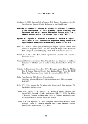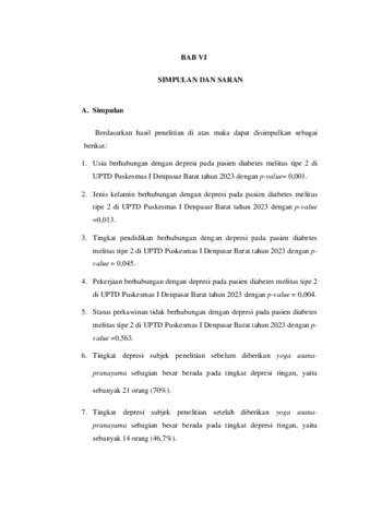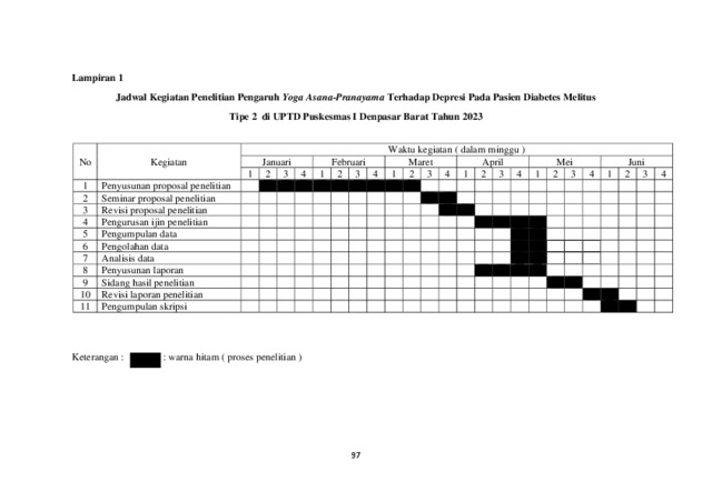 THE EFECT OF YOGA ASANA-PRANAYAMA ON DEPRESSION IN TYPE 2 DIABETES MELLITUS PATIENTS AT UPTD PUSKESMAS I DENPASAR BARAT IN 2023 ABSTRACT Diabetes mellitus is a chronic disease caused by abnormalities in insulin function, insulin secretion, or both. Diabetes mellitus patients are at high risk of experiencing depression and ultimately worsen self-care. Therefore, psychological interventions are necessary, such as yoga asana-pranayama. The research aims to prove the effect of yoga asana-pranayama on depression in type 2 diabetes mellitus patients at UPTD I Denpasar Barat in 2023. The method of research used pre-experimental with one-group pre-post test design. The sampling technique used purposive sampling of 30 people. The research instrument used Beck Depression Inventory-II (BDI-II). The normality test uses Shapiro-Wilk test. The hypothesis using Wilcoxon Signed Rank Test. The results showed that the depression level of the research subjects before being given treatment mostly were in mild depression category of 21 people (70%) and after being given treatment mostly were in the mild depression category of 14 people (46.7%). After analysis, it was found that p-value = 0.000 (p <0.050). The conclusion of research is that there is an effect of yoga asana-pranayama on depression in type 2 diabetes mellitus patients at UPTD Puskesmas I Denpasar Barat in 2023. Keywords: Yoga asana-pranayama, Depression, Diabetes mellitus PENGARUH YOGA ASANA-PRANAYAMA TERHADAP DEPRESI PADA PASIEN DIABETES MELITUS TIPE 2 DI UPTD PUSKESMAS I DENPASAR BARAT TAHUN 2023 ABSTRAK Diabetes melitus merupakan penyakit kronis yang disebabkan oleh kelainan kerja insulin, sekresi insulin, atau keduanya. Pasien Diabetes melitus berisiko tinggi mengalami depresi dan akhirnya memperburuk perawatan diri. Oleh karena itu perlu suatu penanganan psikologis, salah satunya dengan yoga asana-pranayama. Tujuan penelitian ini mengetahui pengaruh yoga asana-pranayama terhadap depresi pada pasien diabetes melitus tipe 2 di UPTD I Denpasar Barat tahun 2023. Penelitian ini menggunakan metode pre-experimental dengan rancangan one-group pre-post test design. Teknik sampling menggunakan purposive sampling sebanyak 30 orang. Instrumen penelitian menggunakan Beck Depression Inventory-II (BDI-II). Uji normalitas menggunakan uji Shapiro wilk. Uji hipotesis menggunakan Wilcoxon Signed Rank Test. Hasil penelitian menunjukkan tingkat depresi subjek penelitian sebelum diberikan perlakuan sebagian besar dalam kategori depresi ringan sebanyak 21 orang (70%) dan setelah diberikan perlakuan sebagian besar dalam kategori depresi ringan sebanyak 14 orang (46,7%). Setelah dianalisis didapatkan p-value= 0,000 (p<0,050). Simpulan penelitian yaitu ada pengaruh yoga asana-pranayama terhadap depresi pada pasien diabetes melitus tipe 2 di UPTD Puskesmas I Denpasar Barat Tahun 2023. Kata kunci : Yoga asana-pranayama, Depresi, Diabetes melitus