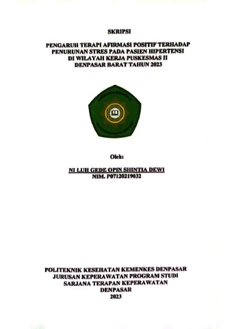 Dewi, Ni Luh Gede Opin Shintia (2023) PENGARUH TERAPI AFIRMASI POSITIF TERHADAP PENURUNAN STRES PADA PASIEN HIPERTENSI DI WILAYAH KERJA PUSKESMAS II DENPASAR BARAT TAHUN 2023. Diploma thesis, Poltekkes Kemenkes Denpasar Jurusan Keperawatan 2023.