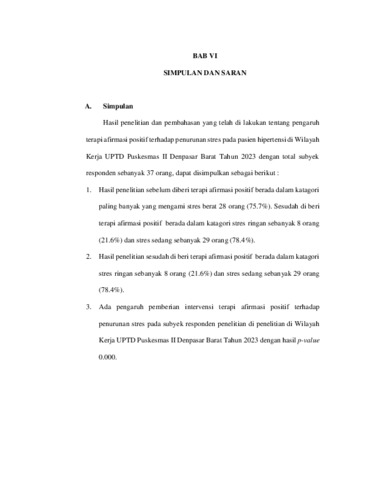 Uncontrolled Keywords: Kata kunci: Terapi Afirmasi Positif, Stres, Hipertensi Keywords : Positive Affirmation, Stress, Hypertension