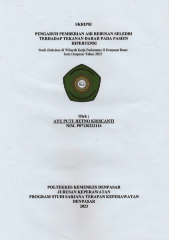 Kriscanti, Ayu Putu Retno (2023) PENGARUH PEMBERIAN AIR REBUSAN SELEDRI TERHADAP TEKANAN DARAH PADA PASIEN HIPERTENSI STUDI DILAKUKAN DI WILAYAH KERJA PUSKESMAS II DENPASAR BARAT KOTA DENPASAR TAHUN 2023. Diploma thesis, Poltekkes Kemenkes Denpasar Jurusan Keperawatan 2023.