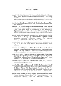 THE EFFECT OF GIVING CELERY BOILED WATER ON BLOOD PRESSURE IN PATIENTS HYPERTENSION The study was conducted in the West Denpasar Health Center II Work Area Denpasar City in 2023 ABSTRACT Hypertension is a condition where there is an increase in blood pressure above the normal threshold of 120/80 mmHg. Hypertension is also referred to as the silent killer because it is often without complaints, so sufferers do not know they have hypertension and are only discovered after complications occur. The aim of this study was to determine the effect of giving celery boiled water on blood pressure in hypertensive patients in the working area of Puskesmas II West Denpasar in 2023. The type of research used was a quasi-experimental with a non-equivalent control group design. The sampling technique used is a non-probability sampling technique with a purposive sampling approach. The number of samples used in this study were 50 samples which were divided into 2 groups, namely the treatment group and the control group. The results showed that the average blood pressure before being given celery boiled water systolic 150.00 mmHg diastolic 92.80 mmHg and after being given celery boiled water systolic 136.40 mmHg diastolic 89.40 mmHg. Statistical testing using the Wilxocon test obtained P value = 0.000 systolic pressure and P value = 0.003 diastolic pressure <0.05. In conclusion, there is an effect of giving celery boiled water on blood pressure in hypertensive patients. Suggestions to further researchers pay attention to obtaining research permits so that the research process runs smoothly. Keywords: Hypertension, Celery Water, Influence PENGARUH PEMBERIAN AIR REBUSAN SELEDRI TERHADAP TEKANAN DARAH PADA PASIEN HIPERTENSI Studi dilakukan di Wilayah Kerja Puskesmas II Denpasar Barat Kota Denpasar Tahun 2023 ABSTRAK Hipertensi merupakan suatu keadaan dimana terjadi peningkatan tekanan darah di atas ambang batas normal yaitu 120/80 mmHg. Hipertensi juga disebut sebagai the silent killer karena sering tanpa keluhan, sehingga penderita tidak mengetahui dirinya menyandang hipertensi dan baru diketahui setelah terjadi komplikasi. Tujuan dari penelitian adalah Mengetahui Pengaruh Pemberian Air Rebusan Seledri Terhadap Tekanan Darah Pada Pasien Hipertensi Di Wilayah Kerja Puskesmas II Denpasar Barat Tahun 2023. Jenis penelitian yang digunakan adalah quasi-eksperimental dengan rancangan non equivalent control grup. Teknik sampling yang digunakan adalah teknik non probability sampling dengan pendekatan purposive sampling. Jumlah sampel yang digunakan dalam penelitian ini 50 sampel yang dibagi menjadi 2 kelompok yaitu kelompok perlakuan dan kelompok kontrol. Hasil penelitian menunjukan rata-rata tekanan darah sebelum diberikan air rebusan seledri sistolik 150.00 mmHg diastolik 92,80 mmHg dan sesudah diberikan air rebusan seledri sistolik 136.40 mmHg diastolik 89,40 mmHg. Pengujian statistik dengan menggunakan uji Wilxocon test didapatkan P value = 0,000 tekanan sistolik dan P value = 0,003 tekanan diastolik < 0,05. Kesimpulannnya terdapat pengaruh pemberian air rebusan seledri terhadap tekanan darah pada pasien hipertensi. Saran kepada peneliti selanjutnya memperhatikan pengurusan izin penelitian agar proses penelitian berlangsung lancar. Kata kunci : Hipertensi, Air Rebusan Seledri, Pengaruh