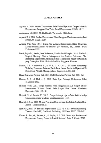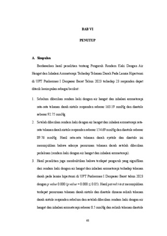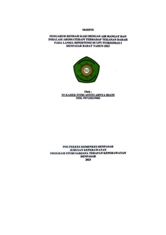 THE EFFECT OF WARM WATER FOOT SOAT AND AROMATHERAPY INHALATION ON BLOOD PRESSURE IN HYPERTENSION ELDERLY AT UPT PUSKESMAS I DENPASAR BARAT IN 2023 ABSTRACT Hypertension is a condition or condition in which a person experiences an increase in blood pressure above normal limits which will cause morbidity and even death. Efforts that can be made as a treatment are soaking the feet in warm water and inhaling aromatherapy. The purpose of this study was to determine the effect of soaking feet in warm water and inhaling aromatherapy on blood pressure in elderly hypertensives. This type of research is Pre-Experimental Design with the design used pre-post design with purposive sampling. The number of samples used in this study were 23 elderly hypertensive respondents who were in the West Denpasar Health Center I area. With the results of the difference in the average decrease in systolic blood pressure of 8.5 mmHg and an average decrease in diastolic blood pressure of 2.99 mmHg. The results of the test using the Paired T-Test can be seen that the significance value is 0.00 <0.05, which means that there is an effect of soaking feet with warm water and inhaling aromatherapy on systolic and diastolic blood pressure in elderly hypertensives at Health Center I West Denpasar in 2023. Based on In this study, it is suggested that soaking feet in warm water and inhaling aromatherapy can be used as a non-pharmacological therapy to reduce blood pressure. Keywords : Foot soak, aromatherapy inhalation, hypertension PENGARUH RENDAM KAKI DENGAN AIR HANGAT DAN INHALASI AROMATERAPI TERHADAP TEKANAN DARAH PADA LANSIA HIPERTENSI DI UPT PUSKESMAS I DENPASAR BARAT TAHUN 2023 ABSTRAK Hipertensi adalah suatu kondisi atau keadaan dimana seseorang mengalami kenaikan tekanan darah di atas batas normal yang akan menyebabkan kesakitan bahkan kematian. Upaya yang dapat dilakukan sebagai pengobatan adalah rendam kaki dengan air hangat dan inhalasi aromaterapi. Tujuan Penelitian ini adalah untuk mengetahui pengaruh rendam kaki dengan air hangat dan inhalasi aromaterapi terhadap tekanan darah pada lansia hipertensi. Jenis penelitian ini adalah Pre Experimental Design dengan rancangan yang digunakan pre-post design dengan purposive sampling. Jumlah sampel yang digunakan dalam penelitian ini adalah 23 responden lansia hipertensi yang berada di wilayah Puskesmas I Denpasar Barat. Dengan hasil selisih rata-rata penurunan tekanan darah sistole sebesar 8.5 mmHg dan rata-rata penurunan pada tekanan darah diastole sebesar 2.99 mmHg. Hasil pengujian menggunakan uji Paired T-Test dapat diketahui nilai signifikansi bernilai 0,00 < 0,05 yang artinya terdapat pengaruh rendam kaki dengan air hangat dan inhalasi aromaterapi terhadap tekanan darah systole maupun diastole pada lansia hipertensi di Puskesmas I Denpasar Barat Tahun 2023. Berdasarkan penelitian ini maka diasarankan agar rendam kaki dengan air hangat dan inhalasi aromaterapi dapat dijadikan terapi non-farmalokogi untuk menurunkan tekanan darah. Kata Kunci : Rendam Kaki, Inhalasi Aromaterapi, Hipertensi