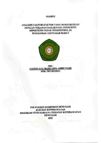 Adhiutami, I Gusti Ayu Made Lina (2023) ANALISIS FAKTOR-FAKTOR YANG BERHUBUNGAN DENGAN TEKANAN DARAH PADA PENDERITA HIPERTENSI TIDAK TERKONTROL DI PUSKESMAS I DENPASAR BARAT. Diploma thesis, Poltekkes Kemenkes Denpasar Jurusan Keperawatan 2023.
