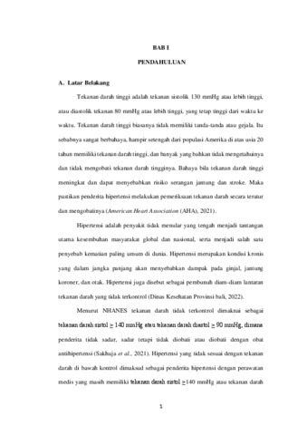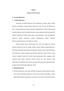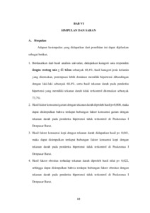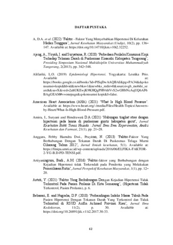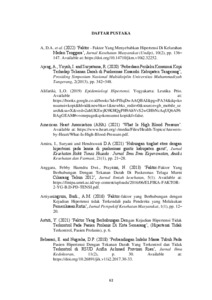 ANALYSIS OF FACTORS RELATED TO BLOOD PRESSURE IN UNCONTROLLED HYPERTENSION PATIENTS AT PUSKESMAS I DENPASAR BARAT ABSTRACT Hypertension is a non-communicable disease which is currently a major challenge for global and national community healing, and is one of the most common causes of death in the world. According to NHANES, uncontrolled blood pressure is defined as systolic blood pressure ≥ 140 mmHg or diastolic blood pressure ≥ 90 mmHg, where the patient is unconscious, conscious but not treated or treated with antihypertensive drugs. Factors that can cause uncontrolled blood pressure are uncontrollable and controllable factors, namely, salt consumption, coffee consumption, and obesity. The purpose of this study was to analyze the factors associated with blood pressure in patients with uncontrolled hypertension at Puskesmas I West Denpasar. This study used a cross-sectional analytic survey approach, involving 57 people using the accidental sampling method. Statistical analysis using Chi square. The characteristics of the respondents were age ≥ 61 years (68.4%), female sex was more dominant than male (68.4%), and hypertension sufferers who had uncontrolled blood pressure (73.7%). The results of the chi square analysis showed that the salt consumption factor was p=0.000, the coffee consumption factor was p=0.041, and the obesity factor was p=0.022. The factor that is most closely related to the increase in blood pressure is coffee consumption with an OR value of 0.224 times. Suggestion: Health workers need to provide information about DASH (Dietary Approaches To Stop Hypertension) for hypertension sufferers to help reduce increased blood pressure apart from taking antihypertensive drugs regularly. Keywords: factors; blood pressure; uncontrolled hypertension. ANALISIS FAKTOR-FAKTOR YANG BERHUBUNGAN DENGAN TEKANAN DARAH PADA PENDERITA HIPERTENSI TIDAK TERKONTROL DI PUSKESMAS I DENPASAR BARAT ABSTRAK Hipertensi ialah penyakit tidak menular yang tengah menjadi tantangan utama kesembuhan masyarakat global dan nasional, serta menjadi salah satu penyebab kematian paling umum di dunia. Menurut NHANES tekanan darah tidak terkontrol dimaknai sebagai tekanan darah sistol ≥ 140 mmHg atau tekanan darah diastol ≥ 90 mmHg, dimana penderita tidak sadar, sadar tetapi tidak diobati atau diobati dengan obat antihipertensi. Faktor-faktor yang dapat menimbulkan tekanan darah tidak terkontrol ialah faktor yang tidak dapat dikontrol dan faktor dapat dikontrol yaitu, konsumsi garam, konsumsi kopi, dan obesitas. Tujuan penelitian ini untuk menganalisis faktor-faktor yang berhubungan dengan tekanan darah pada penderita hipertensi tidak terkontrol di Puskesmas I Denpasar Barat. Penelitian ini menggunakan pendekatan cross-sectional survei analitik, sebanyak 57 orang dengan metode accidental sampling. Analisis statistik menggunakan Chi square. Karakteristik responden didapatkan usia ≥ 61 tahun (68,4%), jenis kelamin perempuan lebih dominan dengan laki-laki (68,4%), serta penderita hipertensi yang memiliki tekanan darah tidak terkontrol (73,7%). Hasil dari analisis chi square, faktor konsumsi garam p=0,000, faktor konsumsi kopi p=0,041, serta faktor obesitas p=0,022. Faktor yang paling erat berhubungan dengan peningkatan terjadinya tekanan darah yaitu konsumsi kopi dengan nilai OR 0,224 kali. Saran: Tenaga kesehatan perlu memberikan informasi mengenai DASH (Dietary Approaches To Stop Hypertension) pada penderita hipertensi untuk membantu menurunkan peningkatan tekanan darah selain mengkonsumsi obat antihipertensi dengan rutin. Kata kunci : faktor-faktor; tekanan darah; hipertensi tidak terkontrol.