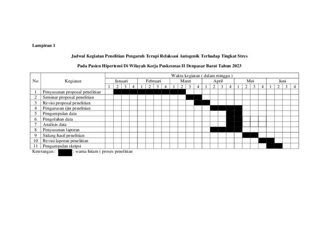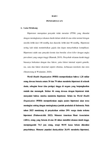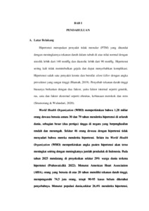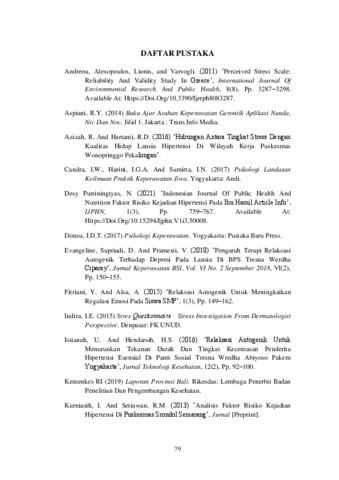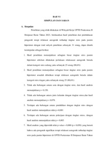 EFFECT OF AUTOGENIC RELAXATION THERAPY ON STRESS LEVELS IN HYPERTENSION PATIENTS IN UPTD PUSKESMAS WEST DENPASAR YEAR 2023 ABSTRACT Cases of hypertension or high blood pressure in Indonesia are quite high. Hypertension occurs because an increase in uncontrolled blood pressure affects heart and blood vessel disease which causes patients to experience psychological problems, one of which is stress due to the disease they are experiencing. One way to overcome this is by doing autogenic relaxation therapy. The purpose of this study was to identify stress levels before and after being given autogenic relaxation therapy treatment and to prove the effect of autogenic relaxation therapy on reducing stress levels in hypertensive patients at the UPTD Puskesmas II West Denpasar in 2023. The study design used a pre-experimental with one-group pretest -posttest design using non-probability sampling with porposive sampling technique. The number of samples is 31 people. The instrument in this study used the Perceived Stress Scale (PSS) consisting of 10 questions. The results showed that of the 31 research subjects, their stress levels before being given treatment were mostly in the moderate stress category, 25 people (80.6%) and after being given treatment, most were in the mild stress category, 25 people (80.6%). Hypothesis testing was carried out using the Wilcoxon test with a p value of 0.000 (p = 0.05) which means that there is a significant relationship between autogenic relaxation therapy and reduced stress levels in hypertensive patients at UPTD Puskesmas II West Denpasar in 2023. The conclusion is that there is an effect of therapy autogenic relaxation on stress levels in hypertensive patients. Recommendations for future researchers are expected to use random sampling techniques in sampling Keywords: Autogenic Relaxation Therapy, Stress, Hypertension PENGARUH TERAPI RELAKSASI AUTOGENIK TERHADAP TINGKAT STRES PADA PASIEN HIPERTENSI DI UPTD PUSKESMAS II DENPASAR BARAT TAHUN 2023 ABSTRAK Kasus hipertensi atau tekanan darah tinggi di Indonesia cukup tinggi. Hipertensi terjadi karena peningkatan tekanan darah tidak terkontrol berpengaruh terhadap penyakit jantung dan pembuluh darah yang menyebabkan pasien mengalami masalah psikologis salah satunya yaitu stres akibat penyakit yang dialaminya. Salah satu cara untuk mengatasinya dengan melakukan terapi relaksasi autogenik. Tujuan penelitian ini adalah untuk mengidentifikasi tingkat stres sebelum dan setelah diberikan perlakuan terapi relaksasi autogenik serta membuktikan pengaruh terapi relaksasi autogenik terhadap penurunan tingkat stres pada pasien hipertensi di UPTD Puskesmas II Denpasar Barat Tahun 2023. Desain penelitian ini menggunakan pre-eksperimental dengan one-group pretest-posttest design menggunakan non-probality sampling dengan teknik porposive sampling. Jumlah sampel 31 orang. Instrumen pada penelitian ini menggunakan Perceived stress scale (PSS) terdiri 10 pertanyaan. Hasil penelitian menunjukkan dari 31 orang subyek penelitian tingkat stres sebelum diberikan perlakuan sebagian besar dalam kategori stres sedang 25 orang (80,6%) dan setelah diberikan perlakuan sebagian besar dalam kategori stres ringan 25 orang (80,6%). Uji hipotesis dilakukan dengan menggunakan uji wilcoxon dengan nilai p value 0,000 (p=0,05) dapat diartikan bahwa ada hubungan yang signifikan terapi relaksasi autogenik terhadap penurunan tingkat stres pada pasien hipertensi di UPTD Puskesmas II Denpasar Barat Tahun 2023. Kesimpulannya bahwa ada pengaruh terapi relaksasi autogenik terhadap tingkat stres pada pasien hipertensi. Rekomendasi bagi peneliti selanjutnya diharapkan dapat menggunakan teknik random sampling dalam pengambilan sampel Kata Kunci : Terapi Relaksasi Autogenik, Stres, Hipertensi