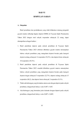 PENGARUH GAYATRI MANTRA TERHADAP TINGKAT DEPRESI PADA ODHA DI YAYASAN SPIRIT PARAMACITTA TAHUN 2023 ABSTRAK HIV merupakan virus yang menyebabkan penurunan sistem imunitas tubuh yang mengakibatkan mudah terinfeksi berbagai macam jenis penyakit disebut dengan AIDS. Selain mengalami gangguan secara fisik ODHA (Orang Dengan HIV/AIDS) mengalami gangguan psikologis seperti depresi. Salah satu cara untuk mengatasi depresi yang dialami ODHA dengan terapi non farmakologi, seperti gayatri mantra. Tujuan penelitian ini adalah menganalisis pengaruh gayatri mantra terhadap tingkat depresi pada ODHA. Jenis penelitian adalah pre-experimental dengan one group pre-posttest design. Sampel diambil dengan metode purposive sampling sebanyak 22 responden. Pengukuran instrument penelitian dengan Beck Depression Inventory II (BDI-II) dengan 21 pertanyaan. Hasil penelitian menunjukan tingkat depresi sebelum diberikan gayatri mantra paling banyak berada pada kategori depresi sedang sebanyak 12 responden (54,5%), dan sesudah diberikan gayatri mantra menunjukan bahwa ada penurunan jumlah tingkat depresi berat menjadi depresi sedang sebanyak 15 responden (68,2%). Hasil penelitian ini diuji dengan uji wilxocon diperoleh nilai p=0,002 artinya ada pengaruh gayatri mantra terhadap penurunan tingkat depresi pada ODHA di Yayasan Spirit Paramacitta Tahun 2023. Kata Kunci : Gayatri Mantra, Depresi, ODHA THE EFFECT OF GAYATRI MANTRA ON THE LEVEL OF DEPRESSION IN PLHIV AT PARAMACITTA SPIRIT FOUNDATION 2023 ABSTRACT HIV is a virus that causes a decrease in the body's immune system which results in being easily infected with various types of diseases called AIDS. In addition to experiencing physical disturbances, PLHIV (People with HIV/AIDS) experience psychological disorders such as depression. One way to deal with depression experienced by PLWHA is non-pharmacological therapy, such as the Gayatri Mantra. The purpose of this study was to analyze the effect of the Gayatri Mantra on the level of depression in PLHIV. This type of research is pre-experimental with one group pre-posttest design. Samples were taken by purposive sampling method as many as 22 respondents. The measurement of the research instrument was the Beck Depression Inventory II (Bdi-II) with 21 questions. The results showed that the level of depression before being given the Gayatri Mantra was mostly in the moderate depression category of 12 respondents (54.5%), and after being given the Gayatri Mantra it showed that there was a decrease in the number of levels of severe depression to moderate depression by 15 respondents (68.2%). ). The results of this study were tested with the Wilxocon test and obtained a value of p = 0.002, meaning that there is an influence of Gayatri Mantra on reducing the level of depression in PLWHA at the Spirit Paramacitta Foundation in 2023. Keywords: Gayatri Mantra, Depression, PLHIV