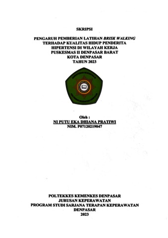 Pratiwi, Ni Putu Eka Dhiana (2023) PENGARUH PEMBERIAN LATIHAN BRISK WALKING TERHADAP KUALITAS HIDUP PENDERITA HIPERTENSI DI WILAYAH KERJA PUSKESMAS II DENPASAR BARAT KOTA DENPASAR TAHUN 2023. Diploma thesis, Poltekkes Kemenkes Denpasar Jurusan Keperawatan 2023.