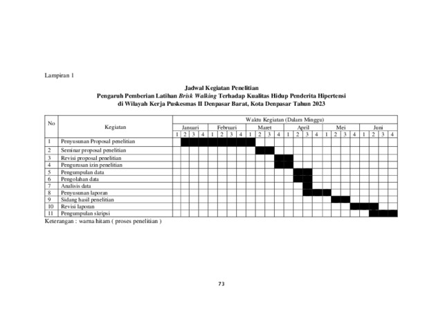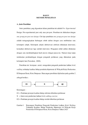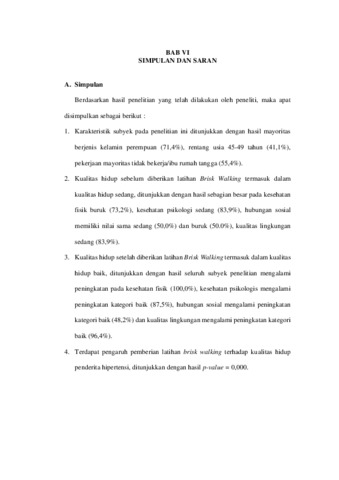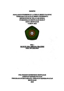 THE INFLUENCE OF GIVING BRISK WALKING TRAINING ON THE QUALITY OF LIFE OF HYPERTENSION PATIENTS IN THE WORKING AREA OF PUSKESMAS II DENPASAR BARAT, DENPASAR CITY YEAR 2023 ABSTRACK Quality of life can be interpreted as an individual's perception of their position in life where in the context of their culture and value system they have goals, expectations and standards in life. Uncontrolled hypertension can affect the quality of life of hypertensive patients to decrease. The aims of research of this study was to determine the effect of providing brist walking exercises on quality of life, namely physical activity in hypertensive patients in the Working Area of Puskesmas 2 West Denpasar, Denpasar City in 2023. This method uses a pre-experimental type of one group pre-post test design. Sampling using non-probability sampling technique with purposive sampling type. Respondents were 56 people. This study used the WHOQOL-BREF questionnaire instrument. The normality test uses the Kormogolov-Smirnov test, the hypothesis test uses the Wilcoxon Signed Test Rank. The results showed that 50 people (50.0%) had poor quality of life before being given the brisk walking exercise, the rest had moderate quality of life, 50 people (50.0%). After treatment, the quality of life increased, as many as 52 people (92.9%) had a good quality of life, the rest had a moderate quality of life, 4 people (7.1%). After being analyzed, the p-value was obtained at sig.(2-tailed) = 0.000 < alpha (0.05). The conclusion there is an effect of brisk walking exercise on the quality of life of hypertension sufferers in the West Denpasar Health Center II Working Area in 2023. Suggestions to West Denpasar Health Center II that brisk walking exercise can be applied to improve the quality of life of hypertension sufferers. Keywords : brisk walking, quality of life, hypertension. PENGARUH PEMBERIAN LATIHAN BRISK WALKING TERHADAP KUALITAS HIDUP PENDERITA HIPERTENSI DI WILAYAH KERJA PUSKESMAS II DENPASAR BARAT KOTA DENPASAR TAHUN 2023 ABSTRAK Kualitas hidup dapat diartikan sebagai persepsi individu mengenai posisi mereka dalam kehidupan dimana dalam konteks budaya dan sistem nilai mereka memiliki suatu tujuan, harapan serta standar dalam hidup. Hipertensi yang tidak terkontrol dapat mempengaruhi kualitas hidup penderita hipertensi semakin menurun. Tujuan penelitian ini mengetahui pengaruh pemberian latihan brist walking terhadap kualitas hidup yaitu aktivitas fisik pada penderita hipertensi di Wilayah Kerja Puskesmas 2 Denpasar Barat Kota Denpasar Tahun 2023. Metode penelitian ini menggunakan pre experimental berjenis one group pre-post test design. Pengambilan sampel dengan teknik non-probability sampling dengan jenis purposive sampling. Responden sebanyak 56 orang. penelitian ini menggunakan instrument kuesioner WHOQOL-BREF. Uji normalitas menggunakan uji kormogolov-smirnov, uji hipotesis menggunakan Wilcoxon Signed Test Rank. Hasil penelitian menunjukkan hasil kualitas hidup responden sebelum diberikan latihan brisk walking buruk sebanyak 28 orang (50,0%), sisanya memiliki kualitas hidup sedang sebanyak 28 orang (50,0%). Setelah perlakuan kualitas hidup meningkat, kualitas hidup baik sebanyak 52 orang (92,9%), sisanya memiliki kualitas hidup sedang 4 orang (7,1%). Setelah dianalisis didapatkan p-value pada sig.(2-taied) = 0,000 < alpha (0,05). Kesimpulannya terdapat pengaruh latihan brisk walking terhadap kualitas hidup penderita hipertensi di Wilayah Kerja Puskesmas II Denpasar Barat tahun 2023. Saran kepada Puskesmas II Denpasar Barat agar latihan brisk walking dapat diterapkan untuk memperbaiki kualitas hidup penderita hipertensi. Kata kunci : brisk walking, kualitas hidup, hipertensi