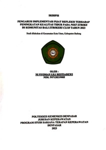 THE EFFECT OF REFLECTION MASSAGE IMPLEMENTATION ON IMPROVING SLEEP QUALITY IN POST STROKE IN THE BALI STROKERS CLUB COMMUNITY IN 2023 ABSTRACT Sleep disorders are often experienced by post-stroke patients with a prevalence ranging from 20-40% of the total post-stroke patients in Indonesia. The purpose of this study was to determine the effect of reflexology on improving sleep quality in post stroke in the Bali Strokers Club community in 2023. The research design used a one-group pre-post test design. The data collection technique uses non-probability sampling, namely total sampling. The number of samples is 11 people. Hypothesis testing using the Paired Sample T-test. The research instrument used the Pittsburgh Sleep Quality Index (PSQI) questionnaire. The results showed that the sleep quality of the respondents before being given reflexology, namely 10 (90.9%) of 11 people experienced poor sleep quality, while the sleep quality of the respondents after being given reflexology showed as many as 6 people (54.5%) showed good sleep quality and 5 people (45.5%) showed poor quality but there was a decrease in score. The results of the analysis obtained p-value = 0.001 <0.05, so that H0 was rejected. It can be concluded that there is an effect of reflexology on improving sleep quality in post stroke in the Bali Strokers Club community in 2023. Recommendations for reflexology health services can be applied as in health centers for non-pharmacological treatment. Keywords: Reflexology, sleep quality, post stroke PENGARUH IMPLEMENTASI PIJAT REFLEKSI TERHADAP PENINGKATAN KUALITAS TIDUR PADA POST STROKE DI KOMUNITAS BALI STROKERS CLUB TAHUN 2023 ABSTRAK Gangguan tidur sering dialami oleh pasien pasca stroke dengan prevalensi berkisar antara 20-40% dari total pasien pasca stroke di Indonesia. Tujuan penelitian ini adalah mengetahui pengaruh pijat refleksi terhadapa peningkatan kualitas tidur pada post stroke di komunitas bali strokers club tahun 2023. Desain penelitian menggunakan rancangan one-group pre-post test design. Teknik pengumpulan data menggunakan non-probability sampling yaitu total sampling. Jumlah sampel sebanyak 11 orang. Uji hipotesis menggunakan Paired Sampel T-test. Instrument penelitian menggunakan kuesioner Pittsburgh Sleep Quality Index (PSQI). Hasil penelitian menunjukkan kualitas tidur responden sebelum diberikan pijat refleksi yaitu 10 (90,9%) dari 11 orang mengalami kualitas tidur yang buruk, sedangkan kualitas tidur responden setelah diberikan pijat refleksi menunjukkan sebanyak 6 orang (54,5%) menunjukkan kualitas tidur baik dan 5 orang (45,5%) menunjukkan kualitas buruk namun terdapat penurunan skor. Hasil analisis diperoleh p-value = 0,001 < 0,05, sehingga H0 ditolak. Dapat disimpulkan ada pengaruh pijat refleksi terhadap peningkatan kualitas tidur pada post stroke di komunitas bali strokers club tahun 2023. Rekomendasi bagi pelayanan kesehatan pijat refleksi dapat diterapkan seperti di puskesmas untuk pemberian pengobatan non farmakologis. Kata kunci: Pijat refleksi, kualitas tidur, post stroke
