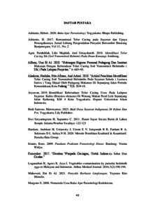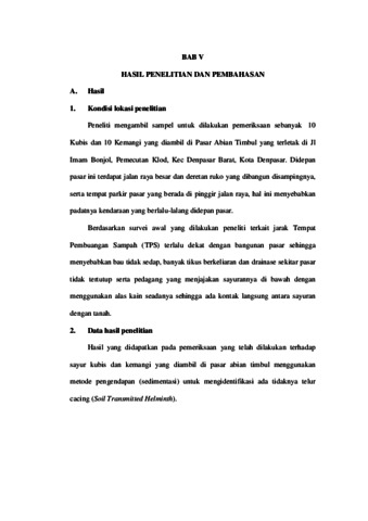 IDENTIFICATION OF WORMS EGGS Soil Transmited Helmints ON CABBAGE VEGETABLES AND BASIL FOR SALE IN THE Market ABIAN TIMBUL THE CITY OF DENPASAR ABSTRACK Worm infection is a disease caused by worms that infect the human body. Worm infection is still a public health problem, especially in developing countries like Indonesia. Worm egg infections are generally transmitted through food, drink and vegetables such as basil which are consumed raw as fresh vegetables which are not clean enough to wash. The purpose of this study was to determine whether there was contamination of Soil Transmitted Helminths eggs which were suspected of being found in cabbage and basil vegetables sold at Abian Timbul Market, Denpasar City. Descriptive research method with qualitative laboratory examination with the Sedimentation method to identify worm eggs. Sampling consisted of 10 cabbages and 10 basil vegetables which were sold by traders in the abian timbul market. The primary data were the data generated from the observed samples of cabbage and basil. From the results of research conducted on cabbage and basil, it showed negative results containing worm eggs, so that cabbage and basil were safe for consumption. Keywords: helminthiasis, vegetables, soil transmitted helminths, sedimentation IDENTIFIKASI TELUR CACING Soil Transmited Helmints PADA SAYURAN KUBIS DAN KEMANGI YANG DIJUAL DI PASAR ABIAN TIMBUL KOTA DENPASAR ABSTRAK Infeksi kecacingan merupakan penyakit yang disebabkan oleh cacing yang menginfeksi tubuh manusia. Infeksi cacing masih menjadi masalah kesehatan pada masyarakat terutama di negara berkembang seperti Indonesia. infeksi telur cacing umumnya ditularkan melalui makanan, minuman dan sayuran seperti kemangi yang dikonsumsi masih mentah sebagai lalapan yang kurang bersih dalam mencuci. Tujuan penelitian ini Untuk mengetahui ada tidaknya kontaminasi telur Soil Transmitted Helminths yang dicurigai terdapat pada sayuran kubis dan kemangi yang dijual di Pasar Abian Timbul Kota Denpasar. Metode penelitian deskriptif dengan pemeriksaan laboratorium secara kualitatif dengan metode Sedimentasi untuk mengidentifikasi telur cacing. Pengambilan sampel adalah 10 sayur kubis dan 10 sayur kemangi yang dijual oleh pedagang di pasar abian timbul. Data primer data yang dihasilkan dari sampel kubis dan kemangi yang diamati. Dari hasil penelitian yang dilakukan pada sayur kubis dan kemangi menunjukan hasil negatif mengandung telur cacing, sehingga sayur kubis dan kemangi aman untuk dikonsumsi. Kata kunci : kecacingan, sayuran, soil transmitted helmints, sedimentasi