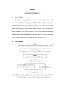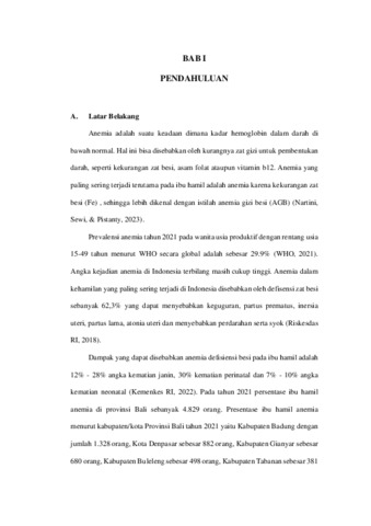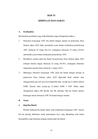 HUBUNGAN FREKUENSI KUNJUNGAN ANC PADA IBU HAMIL DENGAN ANEMIA DI PUSKESMAS KUTA SELATAN ABSTRAK Anemia dalam kehamilan ditandai dengan wajah pucat, kuku mudah rapuh mudah lelah, lemah letih dan lesu. Ibu hamil yang melakukan pelayanan ANC lengkap akan memiliki risiko anemia lebih rendah terdampak anemia Tujuan penelitian ini bertujuan untuk menganalisis apakah terdapat hubungan frekuensi kunjungan ANC pada ibu hamil dengan anemia di puskesmas Kuta Selatan tahun 2023. Metode penelitian ini menggunakan metode penelitian metode observasional dengan desain studi cross sectional yang dilaksanakan di Puskesmas Kuta Selatan pada bulan April – Mei Tahun 2023 melalui teknik total sampling sebanyak 39 responden. Hasil penelitian menunjukkan bahwa ibu hamil yang memenuhi syarat dalam melaksanakan pemeriksaan ANC mengalami anemia ringan sebanyak 14 orang (35,9%), sedangkan responden yang tidak memenuhi syarat melakukan pemeriksaan ANC mayoritas mengalami anemia sedang sebanyak 16 orang (41%). Hasil analisis rank spearman diperoleh nilai asymp.sig (2-sided) sebesar 0,000. Karena nilai asymp.sig (2-sided) 0,000 < 0,05. Maka dapat disimpulkan bahwa H0 ditolak dan Ha diterima. Hal ini berarti adanya hubungan antara frekuensi ANC dengan anemia. Kata Kunci : Anemia, Ibu Hamil, Kunjungan ANC RELATIONSHIP BETWEEN FREQUENCY OF ANC VISITS IN PREGNANT WOMEN WITH ANEMIA IN SOUTH KUTA HEALTH CENTER ABSTRACT Anemia in pregnancy is characterized by a pale face, easily brittle nails, easily tired, weak, tired and lethargic. Pregnant women who carry out complete ANC services will have a lower risk of anemia affected by anemia. The aim of this study was to analyze whether there is a relationship between the frequency of ANC visits to pregnant women and anemia at the South Kuta Health Center in 2023. This research method uses an observational research method with a study design cross sectional which was carried out at the South Kuta Health Center in April - May 2023 using a total sampling technique of 39 respondents. The results showed that pregnant women who regularly carried out ANC examinations experienced mild anemia as many as 14 people (35.9%), while the majority of respondents who did not regularly carry out ANC examinations had moderate anemia as many as 16 people (41%). The results of Spearman's rank analysis obtained an asymp.sig (2sided) value of 0.000. Because the asymp.sig (2-sided) value is 0.000 < 0.05. So it can be concluded that H0 is rejected and Ha is accepted. This means that there is a relationship between the frequency of ANC and anemia. Keywords: Anemia, Pregnant Women, ANC Visits