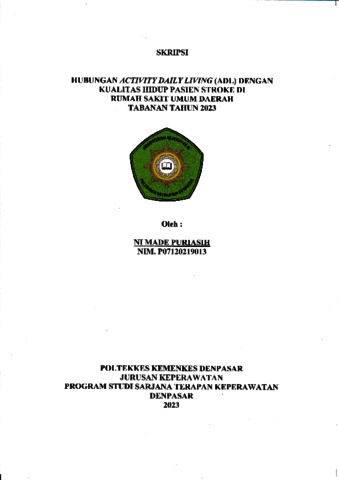 Puriasih, Ni Made (2023) HUBUNGAN ACTIVITY DAILY LIVING (ADL) DENGAN KUALITAS HIDUP PASIEN STROKE DI RUMAH SAKIT UMUM DAERAH TABANAN TAHUN 2023. Diploma thesis, Poltekkes Kemenkes Denpasar.