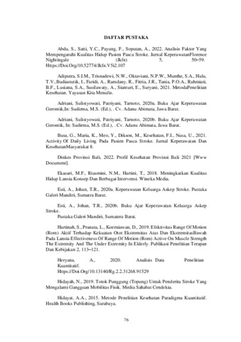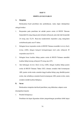 RELATIONSHIP WITH ACTIVITY DAILY LIVING (ADL) WITH QUALITY OF LIFE IN STROKE PATIENTS TABANAN REGIONAL PUBLIC HOSPITAL IN 2023 ABSTRACT Based on Riskesdas 2018, stroke affects millions of people worldwide which results in 5 million deaths each year. The purpose of this study was to determine the relationship between Activity Daily Living (ADL) and the Quality of Life of Stroke Patients at Tabanan General Hospital. The type of research used is correlation analytic research with a cross sectional approach. Respondents in this study were 46 stroke patients. This study used a nonparametric statistical test, namely the Spearman's rank test. The results showed that the average age of the respondents in this study was 67 years. The majority of respondents in this study were male as many as 24 respondents (52.2%) and female as many as 22 respondents (47.8%). The majority of respondents had Activity Daily Living (ADL) with total dependency category, namely 29 respondents or 63.0% and the quality of life of stroke patients at Tabanan Hospital had less quality of life as many as 29 people or 63%. The Spearman's rank test results obtained a p-value = 0.000 (p = 0.000 <0.05) which means the hypothesis is accepted so it can be concluded that there is a relationship between Activity Daily Living (ADL) and the Quality of Life of Stroke Patients at Tabanan Hospital in 2023. Keywords: Activity Daily Living, Quality of Life, Stroke HUBUNGAN ACTIVITY DAILY LIVING (ADL) DENGAN KUALITAS HIDUP PASIEN STROKE DI RUMAH SAKIT UMUM DAERAH TABANAN TAHUN 2023 ABSTRAK Berdasarkan Riskesdas 2018 stroke mempengaruhi jutaan orang di seluruh dunia yang mengakibatkan 5 juta kematian setiap tahunnya. Tujuan penelitian ini untuk mengetahui hubungan Activity Daily Living (ADL) dengan Kualitas Hidup Pasien Stroke di RSUD Tabanan. Jenis penelitian yang digunakan yaitu penelitian analitik korelasi dengan pendekatan cross sectional. Responden pada penelitian ini sebanyak 46 pasien stroke. penelitian ini menggunakan uji statistik nonparametric yaitu uji Spearman’s rank. Hasil penelitian menunjukkan rata-rata usia responden pada penelitian ini adalah 67 tahun. Mayoritas responden penelitian ini berjenis kelamin laki-laki sebanyak 24 responden (52,2%) dan yang berjenis kelamin perempuan sebanyak 22 responden (47,8%). Mayoritas responden memiliki Activity Daily Living (ADL) dengan kategori ketergantungan total yaitu sebanyak 29 responden atau 63,0 % dan kualitas hidup pasien stroke di RSUD Tabanan memiliki kualitas hidup kurang sebanyak 29 orang atau 63%. Hasil uji Spearman’s rank di dapatkan nilai p-value = 0,000 (p = 0,000 < 0,05) yang berarti hipotesis diterima sehingga dapat disimpulkan terdapat hubungan Activity Daily Living (ADL) dengan Kualitas Hidup Pasien Stroke di RSUD Tabanan Tahun 2023. Kata kunci: Activity Daily Living, Kualitas Hidup, Stroke