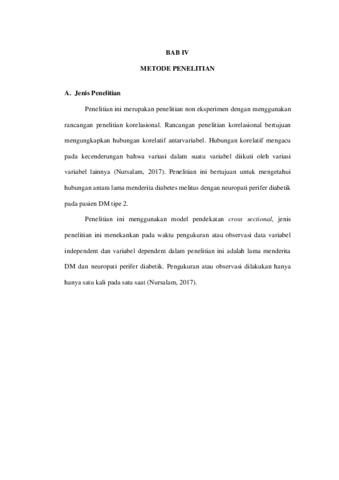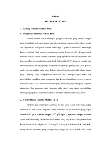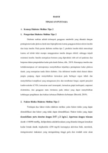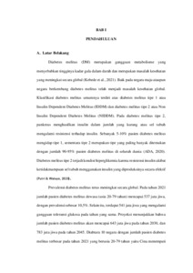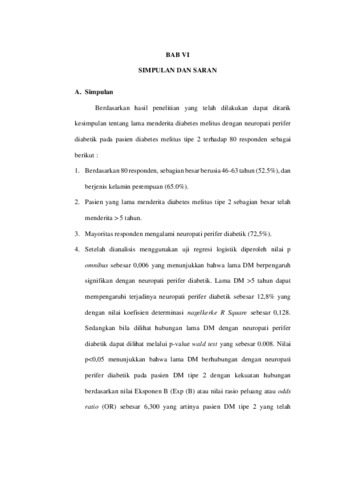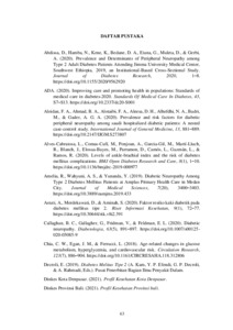 RELATIONSHIP BETWEEN THE DURATION OF DIABETES MELLITUS WITH DIABETIC PERIPHERAL NEUROPATHY IN TYPE 2 DIABETES MELLITUS PATIENTS AT DENPASAR II PUBLIC HEALTH CENTER 2023 ABSTRACT Type 2 diabetes mellitus is characterized by insulin resistance due to body cells not being able to use the insulin they produce effectively, causing an increase in blood glucose levels. If in the long term high blood glucose levels are not controlled can cause complications, one of which is peripheral diabetic neuropathy. Diabetic neuropathy is a chronic complication that results in damage to the nerves. Efforts that can be made are controlling blood glucose levels, doing early detection of neuropathy, and doing foot care. The purpose of this study to determine the duration of diabetes mellitus with diabetic peripheral neuropathy in type 2 diabetes mellitus patients. The type of research used is non-experimental with correlational design and cros sectional approach. The number of samples is 80 people and used non probability sampling with purposive sampling. The duration diabetes mellitus was measured by the observation sheet and diabetic peripheral neuropathy was measured by the DNS questionnaire. The results showed (52.5%) aged 46-63 years, female (65.0%), (72.5%) had peripheral diabetic neuropathy and the duration of type 2 diabetes mellitus > 5 years (86.3%). Test the hypothesis used regresi logistic with p value of the Omnibus test = 0.006 (α = 0.05) and the Nagelkerke R Squere value = 0.128. The study found significant relationship between the duration of diabetes mellitus with diabetic peripheral neuropathy in type 2 diabetes mellitus patients. The nurse need to do early detection with regular foot examinations to find out any signs and symptoms of nerve damage, so as to prevent more severe complications of DM. Keywords : duration of DM, diabetic peripheral neuropathy, type 2 DM vii HUBUNGAN LAMA MENDERITA DIABETES MELITUS DENGAN NEUROPATI PERIFER DIABETIK PADA PASIEN DIABETES MELITUS TIPE 2 DI UPTD PUSKESMAS II DENPASAR BARAT TAHUN 2023 ABSTRAK Diabetes melitus tipe 2 ditandai dengan terjadinya resistensi insulin akibat sel tubuh tidak mampu menggunakan insulin yang diproduksinya secara efektif, sehingga menyebabkan terjadinya peningkatan kadar glukosa darah. Apabila dalam jangka panjang tingginya kadar glukosa darah yang tidak terkontrol dapat menimbulkan komplikasi salah satunya neuropati diabetik perifer. Neuropati diabetik adalah komplikasi kronik yang mengakibatkan kerusakan pada saraf. Upaya yang dapat dilakukan yaitu mengontrol kadar glukosa darah, melakukan deteksi dini neuropati, dan melakukan perawatan kaki. Tujuan penelitian ini untuk mengetahui hubungan lama menderita diabetes melitus dengan neuropati perifer diabetik pada pasien DM tipe 2. Jenis penelitian yang digunakan adalah non-eksperimen dengan rancangan korelasional dan pendekatan cros sectional. Jumlah sampel sebanyak 80 orang dengan metode non probability sampling dengan purposive sampling. Pengumpulan data menggunakan lembar observasi untuk variabel lama menderita DM dan variabel neuropati perifer diabetik menggunakan kuisioner DNS. Hasil penelitian menunjukkan (52.5%) berusia 46-63 tahun, berjenis kelamin perempuan (65.0%), (72,5%) mengalami neuropati diabetik perifer dan menderita diabetes melitus tipe 2 > 5 tahun (86,3%). Uji hipotesis menggunakan uji regresi logistic dengan nilai p omnibus sebesar 0,006 dan nilai nagelkerke R Square sebesar 0,128. Disimpulkan bahwa ada pengaruh signifikan antara lama menderita diabetes melitus dengan neuropati perifer diabetik pada pasien diabetes melitus tipe 2. Perawat perlu melakukan deteksi dini dengan pemeriksaan kaki secara berkala untuk mengetahui adanya tanda dan gejala kerusakan saraf, sehingga dapat mencegah komplikasi DM yang lebih berat. Kata kunci : lama menderita DM, neuropati diabetik perifer, DM tipe 2