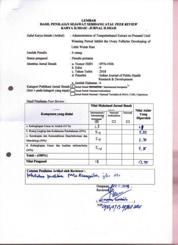 Budiani Ni Nyoman, NN Budiani and SOMOYANI, NI KETUT and MARHAENI, GUSTI AYU and Sriasih, NGK and Erawati L.P.Sri, LP Sri Erawati and Anwar Mallongi, A Mallongi - Administration of Tempehethanol Extract on Prenatal Until Weaning Period Inhibit the Ovary Follicles Developing of Little Wistar Rats. (Unpublished)