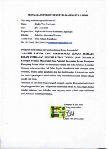 Antari, Kadek Vera Dwi (2020) Analisis Faktor Yang Berhubungan Dengan Perilaku Dalam Pemilahan Sampah Rumah Tangga (Studi Dilakukan di Kelompok Swadaya Masyarakat Desa Paksebali Kecamatan Dawan Kabupaten Klungkung Tahun 2020). Diploma thesis, Politeknik Kesehatan Kemenkes Denpasar Jurusan Kesehatan Lingkungan 2020.