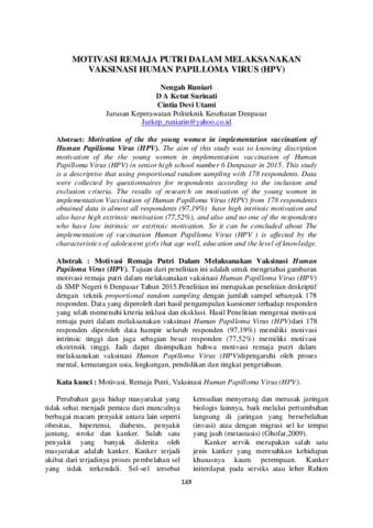 Runiari, Nengah and Surinati, Dewa Ayu Ketut and Utami, Cintia Devi (2015) MOTIVASI REMAJA PUTRI DALAM MELAKSANAKAN VAKSINASI HUMAN PAPILLOMA VIRUS (HPV). Jurnal Gema Keperawatan, 8 (2). pp. 169-174. ISSN 2088 – 7493