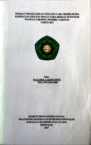 Tedjasulaksana, Regina (2017) Tingkat pengetahuan tentang Cara Memelihara Kesehatan Gigi dan Mulut Pada Remaja di Bajar Wangaya Bendul Penebel Tabanan Tahun 2017. Poltekkes Denpasar.