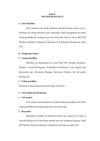 Knowledge is the result of human sensing, or the result of knowing a person against an object through his or her senses. Pregnancy can affect the health of the teeth and mouth, the presence of nausea and vomiting in the morning in pregnant women is caused by increased levels of the hormones estrogen and progesterone. The purpose of this study is to find out an overview of pregnant women's knowledge about the maintenance of dental and oral health in toddlers in Karangasem II Karangasem Regency in 2021. This research uses descriptive research with survey design conducted at the location of KKN IPE Poltekkes Denpasar in Karangasem II Karangasem Regency in 2021. The results showed that the percentage of good category knowledge level as much as 68.63%, knowledge category enough as much as 13.73%, and category less as much as 17.64%. The average level of knowledge of pregnant women about the maintenance of dental and oral health in toddlers as much as 82.65 with a good category. The conclusion of this study is that pregnant women in Karangasem Regency in 2021 have a level of knowledge of dental and oral health maintenance in toddlers with a good category of 68.63% with an average of 82.65. Keywords: Knowledge, Maintenance of Dental and Oral Health of Toddlers, Pregnant Women