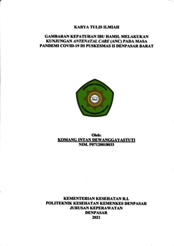 Dewanggayastuti, Komang Intan (2021) GAMBARAN KEPATUHAN IBU HAMIL MELAKUKAN KUNJUNGAN ANTENATAL CARE (ANC) PADA MASA PANDEMI COVID-19 DI PUSKESMAS II DENPASAR BARAT. Diploma thesis, Poltekkes Kemenkes Denpasar.
