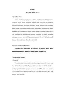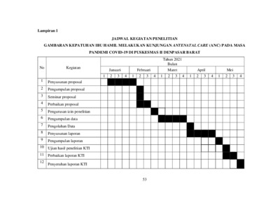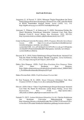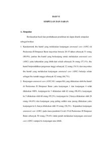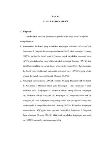 DESCRIPTION OF COMPLIANCE IN PREGNANT WOMEN CONDUCTING VISITS OF ANTENATAL CARE (ANC) DURING THE COVID-19 PANDEMIC AT PUSKESMAS II DENPASAR BARAT ABSTRACT Antenatal care (ANC) is an examination to improve the physical and mental health of pregnant women optimally. ANC examinations during the Covid-19 pandemic were carried out 6 times. The research objective was to describe the compliance of pregnant women in conducting antenatal care (ANC) visits during the Covid-19 pandemic at Puskesmas II Denpasar Barat. This research is a quantitative study with a descriptive research design and a retrospective approach. The research was conducted at Puskesmas II Denpasar Barat in March-April 2021. The population was 1070 pregnant women with a sample of 63 respondents who were determined by purposive sampling. The data source of this research is secondary data with the study technique of the KIA register book documentation and then a descriptive statistical analysis is carried out. The results of this study were visits to ANC K1- K6, only visits 1 and 4 were carried out 100%, other visits had not reached 100% and the rarest were visits to 6 which were only 30,2%. Overall compliance with ANC visits during the Covid-19 pandemic at Puskesmas II West Denpasar as many as 79,4% of pregnant women did not comply with ANC. ANC visit compliance during the Covid-19 pandemic based on its characteristics 61,9% of mothers aged 20-35 years did not comply with ANC, 54% of mothers with more than once parity were not compliant, 31,7% of mothers with higher education were not compliant ANC, and 60,4% of working mothers are not compliant for ANC. Keywords: compliance, antenatal care (ANC), Covid-19 pandemic