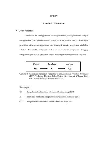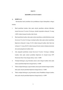 Effect of Emotional Freedom Technique on Sleep Quality of Hypertensive Patients in UPT Puskesmas North Kuta Working Area in 2021 ABSTRACT The increase in blood pressure one of them can be caused by a decrease in sleep quality. The purpose of this study is to find out the influence of Emotional Freedom Technique on the sleep quality of hypertensive patients in the working area of UPT Puskesmas Kuta Utara in 2021. Design research using one-group pre-posttest design. Data collection techniques using nonprobability sampling i.e. purposive sampling. The number of samples as many as 19 people. Test hypotheses using the Wilcoxon Signed Ranks Test. The research instrument uses the Pittsburgh Sleep Quality Index (PSQI). The results showed the quality of sleep of hypertensive patients before being given emotional freedom technique, namely all respondents as many as 19 people (100%) poor sleep quality, while the sleep quality of respondents after being given emotional freedom technique showed as many as 13 people (68.4%) experienced poor sleep quality but showed a decrease in score, the analysis result obtained p<0.05 so Ha rejected. The conclusion is there can be a significant influence of Emotional Freedom Technique (p=0.000) on the sleep quality of hypertensive patients in the working area of UPT Puskesmas Kuta Utara in 2021. Keywords: Emotional Freedom Technique, sleep quality, Hypertension