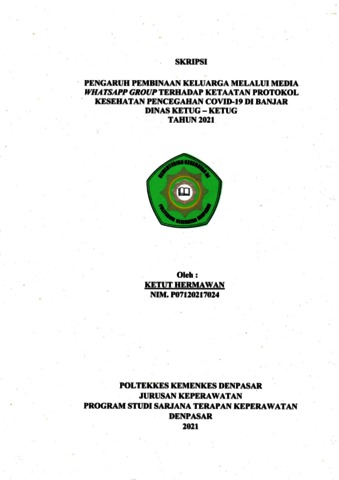 Hermawan, Ketut (2021) PENGARUH PEMBINAAN KELUARGA MELALUI MEDIA WHATSAPP GROUP TERHADAP KETAATAN PROTOKOL KESEHATAN PENCEGAHAN COVID-19 DI BANJAR DINAS KETUG – KETUG TAHUN 2021. Diploma thesis, Poltekkes Kemenkes Denpasar.