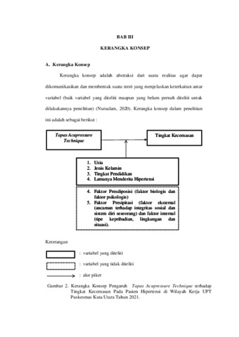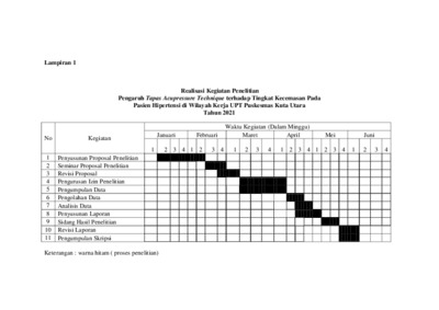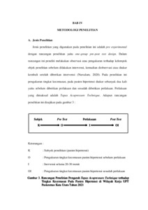 THE EFFECT OF TAPAS ACUPRESSURE TECHNIQUE TO ANXIETY LEVELS ON HYPERTENSION PATIENTS IN WORK AREA OF UPT PUSKESMAS KUTA UTARA ON 2021 ABSTRACT Hypertension is chronic disease that impact the patient's psychology. Treatment tends to be long and risk complications causes hypertension patients experience anxiety. High levels of anxiety affect self-care management and medication. The aims of research to determine effect of Tapas Acupressure Technique to level anxiety hypertension patients in work area of UPT Puskesmas Kuta Utara on 2021. This research used method pre-experimental design with one group pre-post test. Sampling using non-probability with purposive sampling. The number samples was 19 subjects. The normality test uses Shapiro-Wilk. Hypothesis using Wilcoxon Signed Rank Test. The research instrument used Hamilton Anxiety Rating Scale (HARS). The results showed before given Tapas Acupressure Technique most the respondents experienced mild anxiety 13 people (68.4%) and moderate anxiety 6 people (31.6%). After the treatment, level of anxiety decreased, there was no anxiety 5 people (26.3%), 12 people mild anxiety (63.2%), and 2 people moderate anxiety (10.5%). After analyzed, the p-value 0.000 < alpha 0.05. The conclusion that there is effect of Tapas Acupressure Technqiue on anxiety level hypertension patients in work area of UPT Puskesmas Kuta Utara on 2021, meaning that Tapas Acupressure Technique can reduce anxiety level of hypertension patients. Key words : Tapas Acupressure Technique, Anxiety, Hypertension