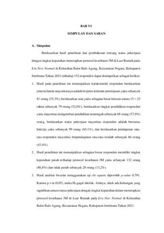 Coronavirus Disease-2019 (COVID-19) is an infectious disease caused by SARS-CoV-2 with primary transmission through droplets and aerosols. The implementation of 3M health protocols (using masks, washing hands with soap and keeping a distance) is an important key in preventing the transmission of COVID-19. Compliance in implementing health protocols is influenced by several factors, one of which is socioeconomic factors, namely employment status. The purpose of this study is to find out the relationship between employment status and community compliance level in implementing 3M health protocols outside the home in the new normal era. The type of research used is observational correlation analytics with cross-sectional approaches. Sampling using purposive sampling technique so that 152 respondents were obtained. The data collection instrument uses a respondent characteristic questionnaire and a 3M health protocol compliance level questionnaire consisting of 15 closed questions using a likert scale. The majority of results were obtained by a majority (86.8%) respondents have an appropriate level of compliance and the rest (13.2%) disobedient. The results of bivariate analysis using chi square test obtained p-value 0.791. Because p > α (0.05), H0 failed to be rejected. That is, there is no significant relationship between employment status and compliance level in implementing 3M health protocols outside the home in the New Normal Era in Baler Bale Agung Village, Negara District, Jembrana Regency in 2021. Keywords: covid-19, employment status, compliance, 3M health protocol
