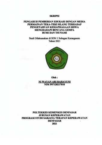 Rahayuni, Ni Wayan Ari (2021) PENGARUH PEMBERIAN EDUKASI DENGAN MEDIA PERMAINAN TEKA-TEKI SILANG TERHADAP PENGETAHUAN KESIAPSIAGAAN SISWA MENGHADAPI BENCANA GEMPA BUMI DAN TSUNAMI. Diploma thesis, Poltekkes Kemenkes Denpasar Jurusan Keperawatan 2021.