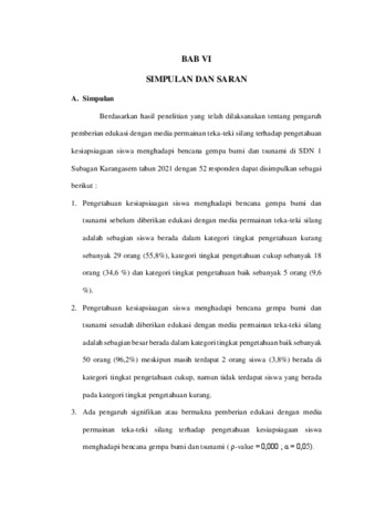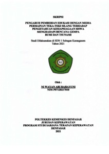 The Effect Educational Learning by Using Crossword Puzzle Games Media Toward Students Knowledge of Preparedness Encountering Earthquakes and Tsunami Disaster at SDN 1 Subagan Karangasem in 2021 ABSTRACT Indonesia is included in a country prone to earthquake and tsunami disasters. Children are a group vulnerable to the impact of disasters, so it is important to provide disaster education to children as an effort to save themselves. The efforts made is increasing knowledge about disaster preparedness. This study provides education to students using the TTS game media which contains material questions related to preparedness measures in the face of earthquake and tsunami disasters. This study aims to determine the effect educational learning by using crossword puzzle games media toward students knowledge of preparedness encountering earthquakes and tsunami disaster. This research is a pre-experimental design with design use One-Group Pretest-Posttest using total sampling technique. The number of samples was 52 people. Data collection was carried out using earthquake and tsunami disaster preparedness questionnaires. The results showed that the value of knowledge before the treatment category was less as many as 29 people (55.8%) and after the good category treatment was 50 people (96.2%). The results of the study were tested with the willcoxon test and it was obtained Sig. = 0.000 <alpha (0.05). This indicates the effect educational learning by using crossword puzzle games media toward students knowledge of preparedness encountering earthquakes and tsunami disaster at SDN 1 Subagan Karangasem in 2021. Recommended for school teachers to increase the provision of disaster education by using the development of other similar game media. Keywords: knowledge, preparedness, crossword puzzle games