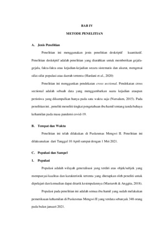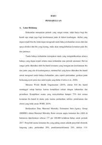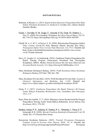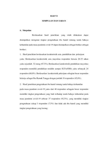 DESCRIPTION OF THE LEVEL KNOWLEDGE OF PREGNANT WOMEN ABOUT THE DANGER SIGNS OF PREGNANCY DURING PANDEMIC COVID-19 AT MENGWI II PUBLIC HEALTH CENTER IN 2021 By : Cintya Yunita Dewi ABSTRACT Danger signs of pregnancy are signs that indicate a danger that can occur during pregnancy, which if not reported or detected early can cause death to the mother and fetus. Danger signs of pregnancy must be treated and detected early because any danger signs of pregnancy can lead to complications during pregnancy. This study was conducted to describe the level of knowledge of pregnant women about the danger signs of pregnancy during the COVID-19 pandemic at the Mengwi II Health Center. This study uses a descriptive type of research with a quantitative approach. Data collection was carried out using a questionnaire entered through the google form. Samples were taken by purposive sampling technique. The number of samples is as many as 40 respondents. The results of this study indicate that the level of knowledge is good, the level of knowledge is sufficient and the level of knowledge is less where it is known that from 40 respondents most of them have a good level of knowledge about the danger signs of pregnancy during the covid-19 pandemic, 37 respondents (92.5%), who have the level of knowledge is sufficient for 3 respondents (7.5%) and there is no pregnant woman who has less knowledge. It is expected that pregnant women who have good knowledge in order to maintain and improve their knowledge and pregnant women who have sufficient and less knowledge to be more active in seeking information that can be obtained. Keywords: Knowledge Level, Pregnancy hazard signs , Pregnant mother